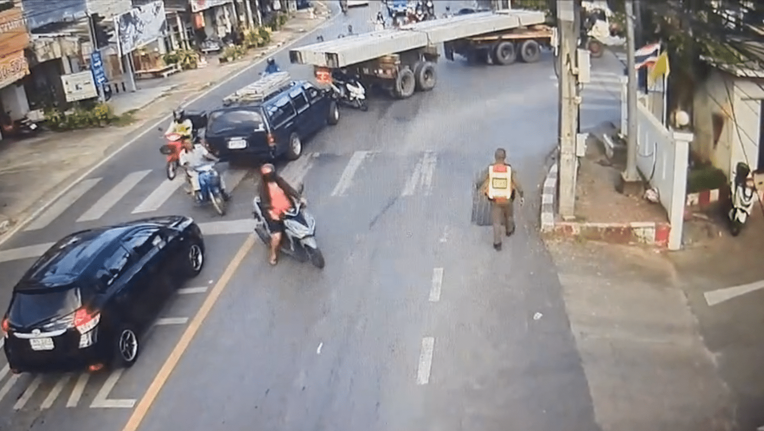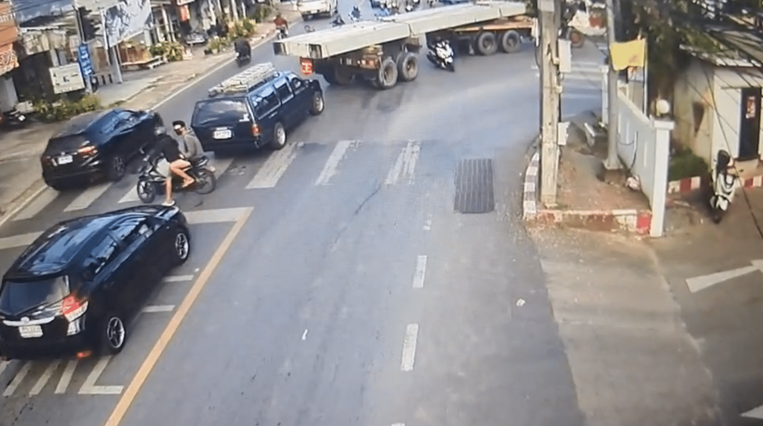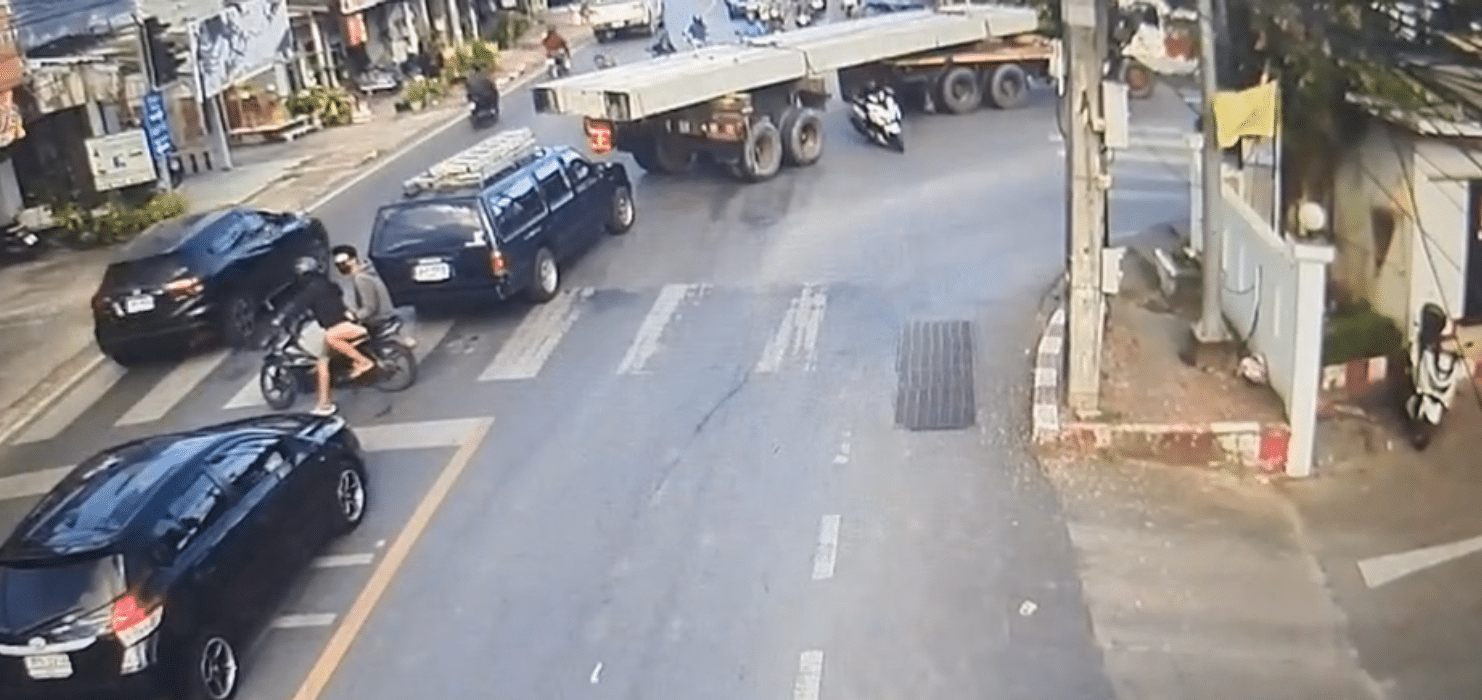 อย่างในคลิป เผยให้เห็นวินัยจราจรของคนไทยผู้ขับขี่รถยนจักรยานยนต์ที่น่ากลัวอย่างถึงขีดสุด รถบรรทุกพ่วง 18 ล้อ ที่ขนเสาปูนยาวมาด้วย ได้เลี้ยวขวา และติดอยู่กลางแยก ขณะที่ทางตรงถึงช่วงของไฟเขียว