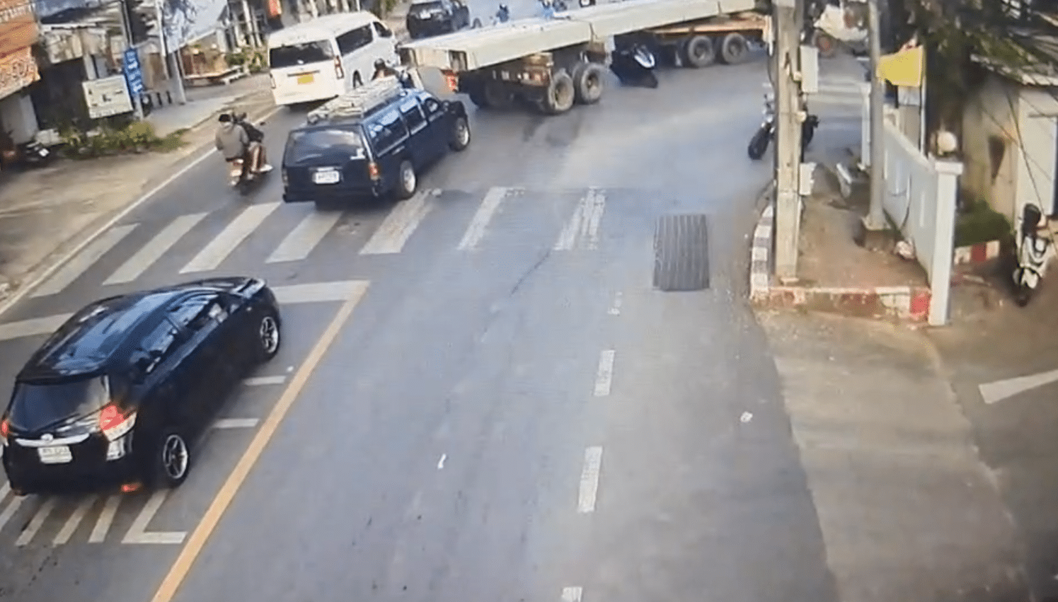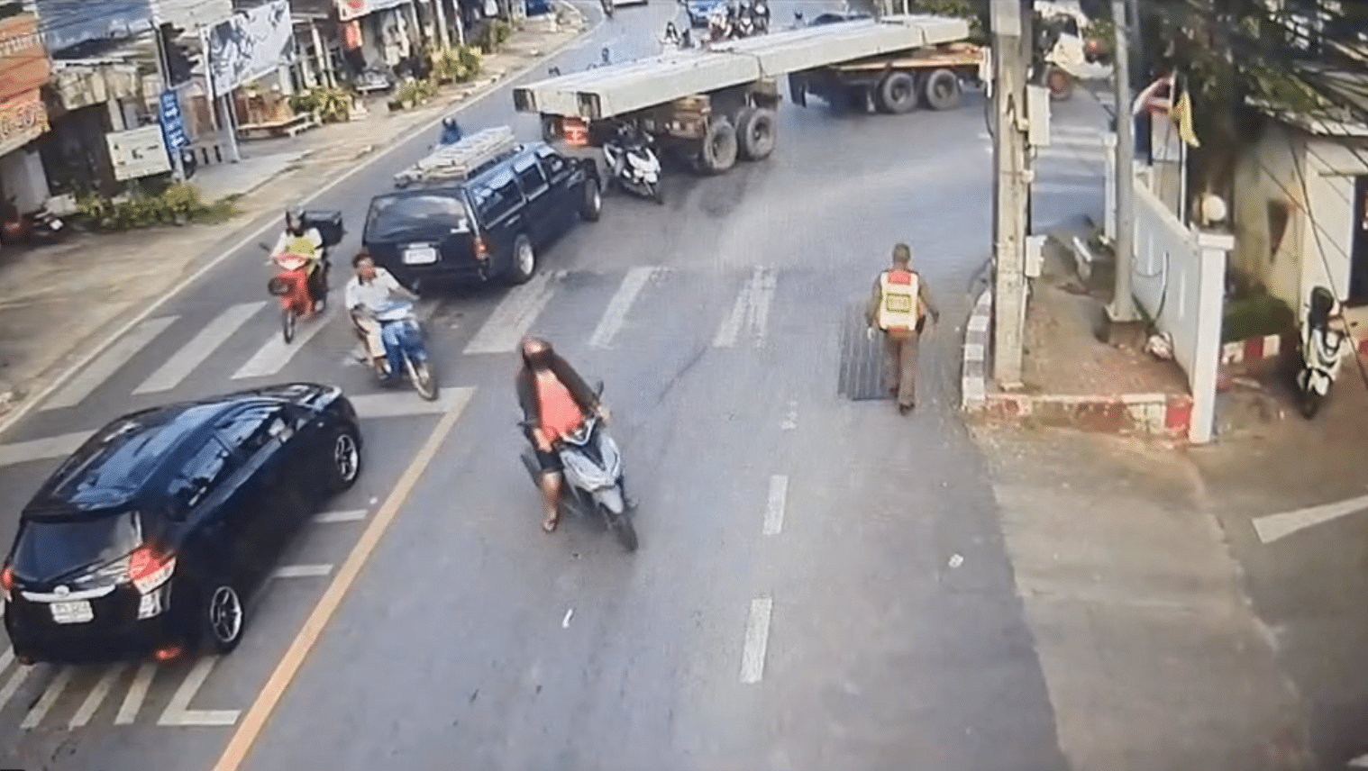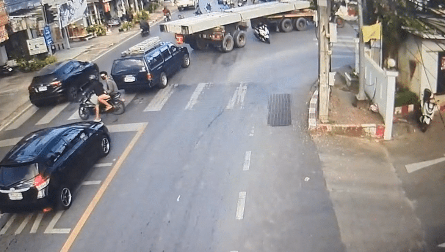 อย่างในคลิป เผยให้เห็นวินัยจราจรของคนไทยผู้ขับขี่รถยนจักรยานยนต์ที่น่ากลัวอย่างถึงขีดสุด รถบรรทุกพ่วง 18 ล้อ ที่ขนเสาปูนยาวมาด้วย ได้เลี้ยวขวา และติดอยู่กลางแยก ขณะที่ทางตรงถึงช่วงของไฟเขียว