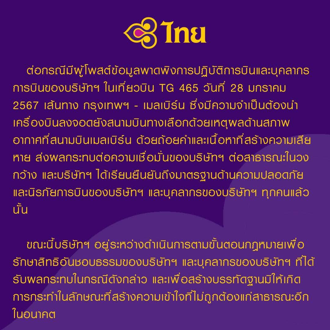 ล่าสุด การบินไทย ออกแถลงถึงเรื่องนี้อีกครั้ง โดยระบุว่า “ต่อกรณีมีผู้โพสต์ข้อมูลพาดพิงการปฏิบัติการบินและบุคลากรการบินของบริษัทฯ ในเที่ยวบิน TG 465 วันที่ 28 มกราคม 2567 เส้นทาง กรุงเทพฯ – เมลเบิร์น ซึ่งมีความจำเป็นต้องนำเครื่องบินลงจอดยังสนามบินทางเลือกด้วยเหตุผลด้านสภาพอากาศที่สนามบินเมลเบิร์น ด้วยถ้อยคำและเนื้อหาที่สร้างความเสียหาย ส่งผลกระทบต่อความเชื่อมั่นของบริษัทฯ ต่อสาธารณะในวงกว้าง และบริษัทฯ ได้เรียนยืนยันถึงมาตรฐานด้านความปลอดภัยและนิรภัยการบินของบริษัทฯ และบุคลากรของบริษัทฯ ทุกคนแล้วนั้น