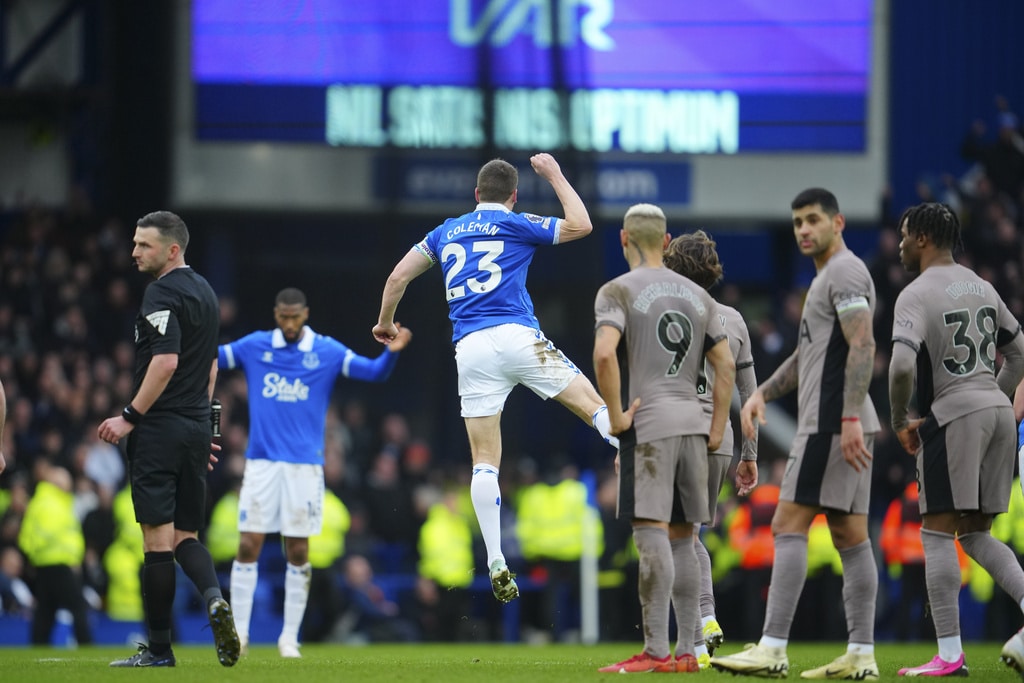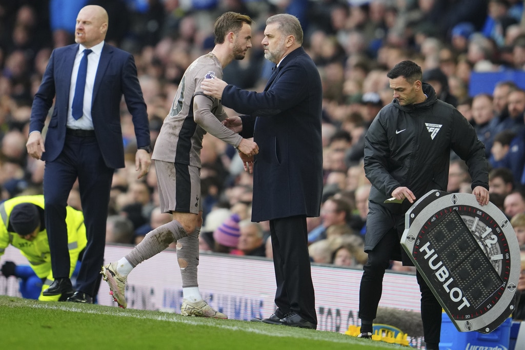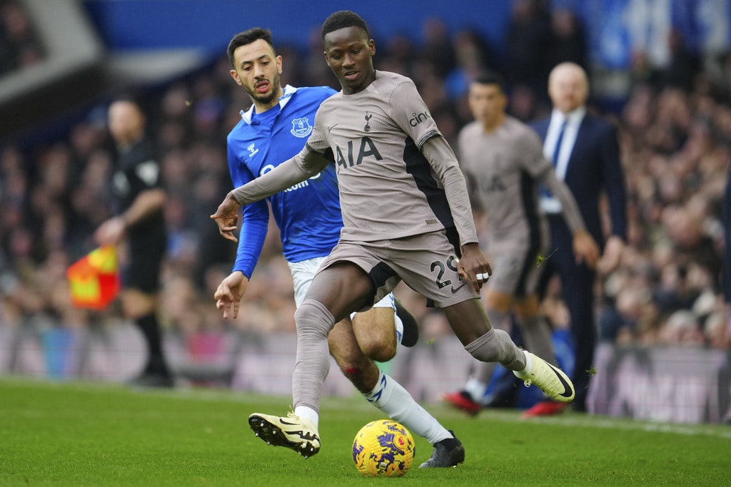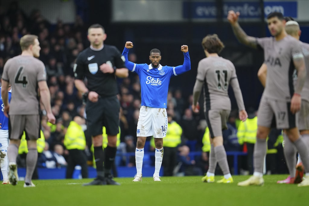 Tottenham’s Rodrigo Bentancur, right, jumps for a header with Everton’s Dominic Calvert-Lewin during the English Premier League soccer match between Everton and Tottenham Hotspur, at the Goodison Park stadium, in Liverpool, England, Saturday, Feb. 3, 2024. (AP Photo/Jon Super)Everton’s Seamus Coleman, right, shakes hands with Everton’s Lewis Dobbin the English Premier League soccer match between Everton and Tottenham Hotspur, at the Goodison Park stadium, in Liverpool, England, Saturday, Feb. 3, 2024. (AP Photo/Jon Super)Everton’s Jarrad Branthwaite applauds fans at the end of the English Premier League soccer match between Everton and Tottenham Hotspur, at the Goodison Park stadium, in Liverpool, England, Saturday, Feb. 3, 2024. (AP Photo/Jon Super)Everton players shake hands at the and of the English Premier League soccer match between Everton and Tottenham Hotspur, at the Goodison Park stadium, in Liverpool, England, Saturday, Feb. 3, 2024. (AP Photo/Jon Super)Everton’s Beto celebrates after the VAR confirmed the equalizer goal scored by Everton’s Jarrad Branthwaite during the English Premier League soccer match between Everton and Tottenham Hotspur, at the Goodison Park stadium, in Liverpool, England, Saturday, Feb. 3, 2024. (AP Photo/Jon Super)Everton’s Beto celebrates after the VAR confirmed the equalizer goal scored by Everton’s Jarrad Branthwaite during the English Premier League soccer match between Everton and Tottenham Hotspur, at the Goodison Park stadium, in Liverpool, England, Saturday, Feb. 3, 2024. (AP Photo/Jon Super)Everton’s Jarrad Branthwaite celebrates after scoring his side’s second goal during the English Premier League soccer match between Everton and Tottenham Hotspur, at the Goodison Park stadium, in Liverpool, England, Saturday, Feb. 3, 2024. (AP Photo/Jon Super)Everton’s Seamus Coleman celebrates after the VAR confirmed the equalizer goal scored by Everton’s Jarrad Branthwaite during the English Premier League soccer match between Everton and Tottenham Hotspur, at the Goodison Park stadium, in Liverpool, England, Saturday, Feb. 3, 2024. (AP Photo/Jon Super)Tottenham’s James Maddison is hugged by Tottenham’s head coach Ange Postecoglou as he leaves the pitch during the English Premier League soccer match between Everton and Tottenham Hotspur, at the Goodison Park stadium, in Liverpool, England, Saturday, Feb. 3, 2024. (AP Photo/Jon Super)Tottenham’s Pape Matar Sarr passes the ball next to Everton’s Dwight McNeil during the English Premier League soccer match between Everton and Tottenham Hotspur, at the Goodison Park stadium, in Liverpool, England, Saturday, Feb. 3, 2024. (AP Photo/Jon Super)