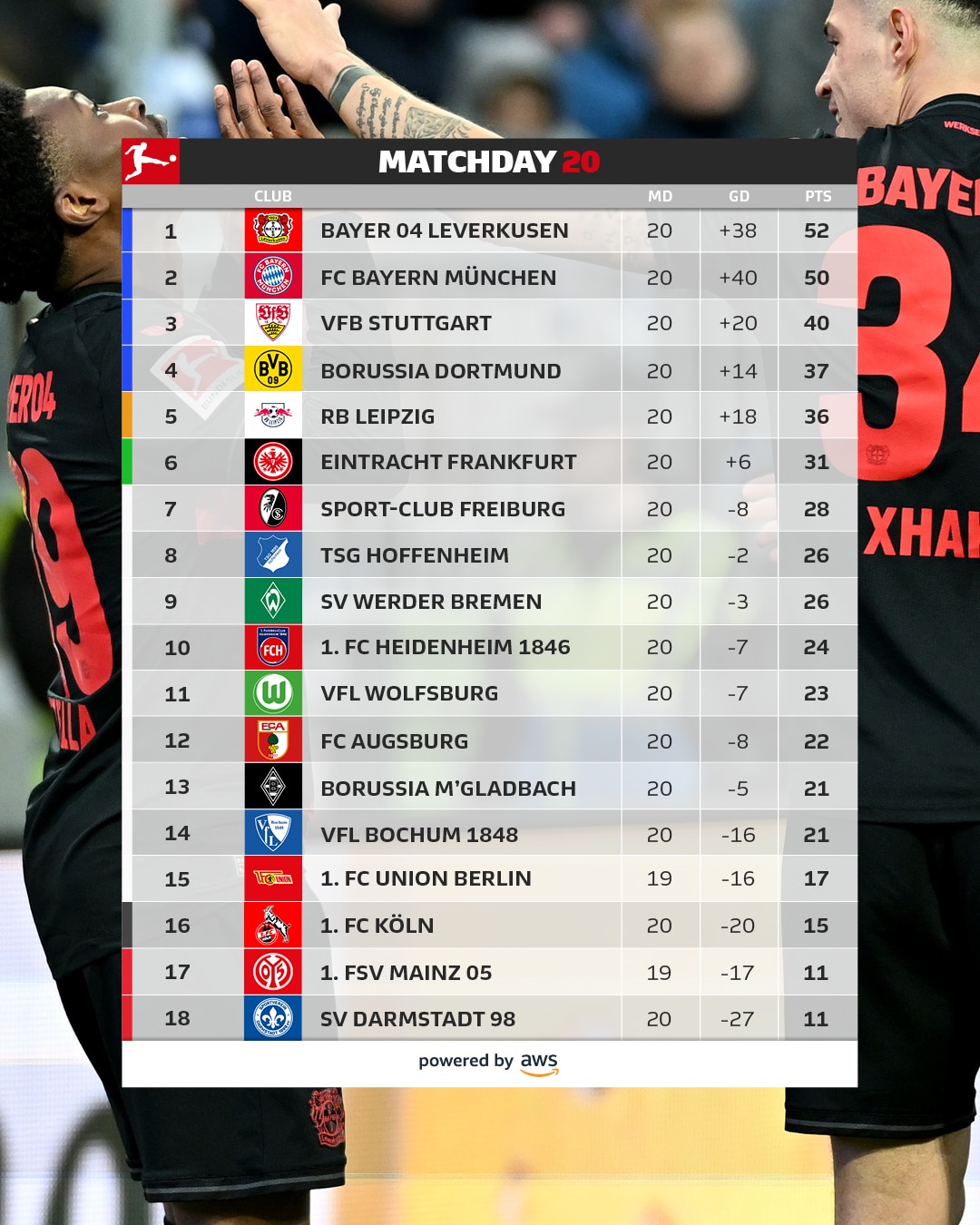 อันดับ ตารางคะแนน บุนเดสลีกา เยอรมัน 2023/24 หลังจบแมตซ์เดย์ที่ 20 โดย 5 อันดับเป็นไปตามลำดับมีดังนี้ (อัปเดตวันที่ 6 กุมภาพันธ์ 2567)