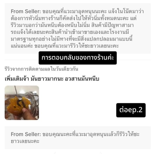 ทว่าการตอบกลับของเจ้าของร้านที่บอกว่าเป็นเพราะลูกค้าแจ้งว่าอยากได้มันหัวนิ่ม อีกทั้งยืนยันว่าสินค้านำเข้ามาขายได้มาตรฐานจากโรงงาน ทุกอย่างไม่มีสิ่งแปลกปลอมแน่นอน พร้อมประโยคทิ้งท้ายซึ่งทำให้หลายคนอ่านแล้วรู้สึกไม่พอใจว่า “ขอบคุณที่แวะมารีวิววให้ซะยาวเลยนะคะ”