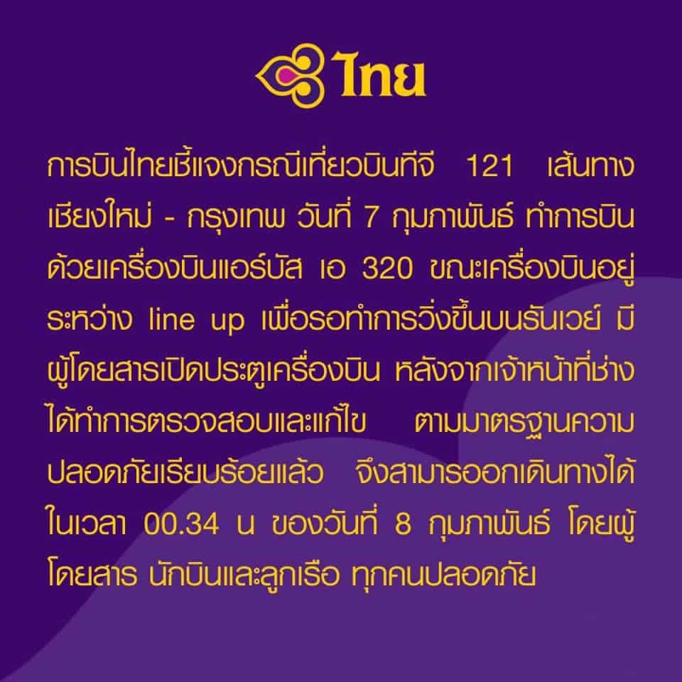 ขณะที่ การบินไทยชี้แจงกรณีเที่ยวบินทีจี 121 เส้นทางเชียงใหม่-กรุงเทพ วันที่ 7 กุมภาพันธ์ ทำการบินด้วยเครื่องบินแอร์บัส เอ 320 ขณะเครื่องบินอยู่ ระหว่าง line up เพื่อรอทำการวิ่งขึ้นบนรันเวย์ มี ผู้โดยสารเปิดประตูเครื่องบิน หลังจากเจ้าหน้าที่ช่าง ได้ทำการตรวจสอบและแก้ไข ตามมาตรฐานความ ปลอดภัยเรียบร้อยแล้ว จึงสามารออกเดินทางได้ ในเวลา 00.34 น ของวันที่ 8 กุมภาพันธ์ โดยผู้ โดยสาร นักบินและลูกเรือ ทุกคนปลอดภัย