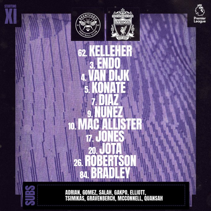 17 กุมภาพันธ์ 2567 รายชื่อผู้เล่น 11 ตัวจริง เบรนท์ฟอร์ด พบ ลิเวอร์พูล ศึกฟุตบอล พรีเมียร์ลีก ฤดูกาล 2023-24 คืนนี้ ลิงก์ถูกลิขสิทธิ์ ดูบอลสดออนไลน์ ทาง True Premier Football เวลา 19:30 น.