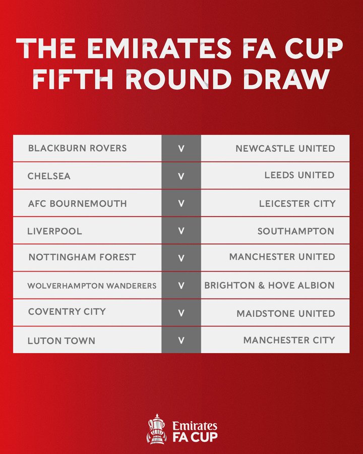 โปรแกรมการแข่งขันฟุตบอล เอฟเอ คัพ รอบ 5 หรือรอบ 16 ทีมสุดท้าย แชมป์เก่าอย่าง แมนซิตี้ บุกเยือน ลูตัน, แมนยู ดวล ฟอเรสต์