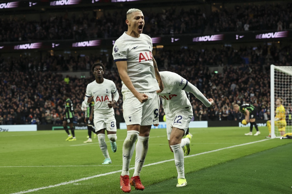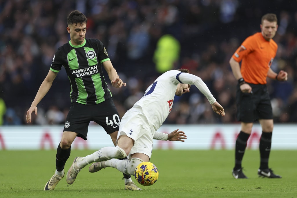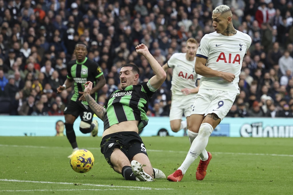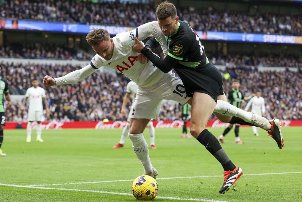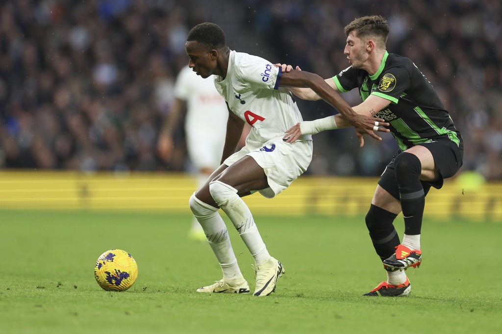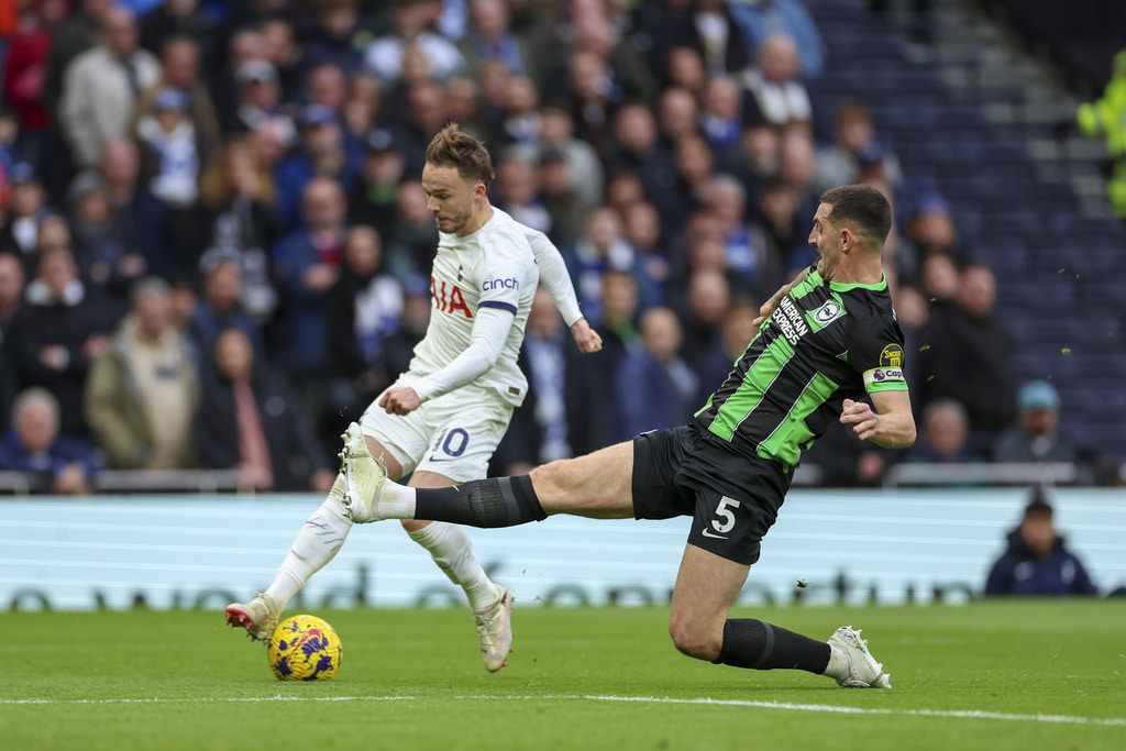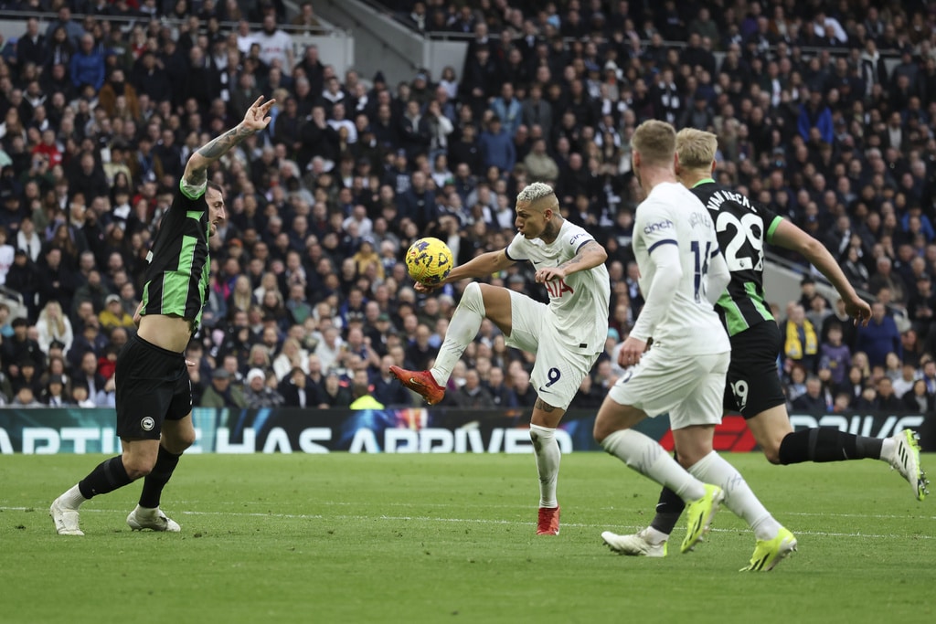 Tottenham’s James Maddison, left, and Brighton’s Pascal Gross fight for the ball during the English Premier League soccer match between Tottenham Hotspur and Brighton & Hove Albion at the Tottenham Hotspur Stadium in London, Saturday, Feb. 10, 2024. (AP Photo/Ian Walton)Tottenham’s Richarlison, center, celebrates after his teammate Brennan Johnson scoring his side’s 2nd goal during the English Premier League soccer match between Tottenham Hotspur and Brighton & Hove Albion at the Tottenham Hotspur Stadium in London, Saturday, Feb. 10, 2024. (AP Photo/Ian Walton)Tottenham’s Son Heung-min, center, applauds to fans after the English Premier League soccer match between Tottenham Hotspur and Brighton & Hove Albion at the Tottenham Hotspur Stadium in London, Saturday, Feb. 10, 2024. (AP Photo/Ian Walton)Tottenham’s Brennan Johnson, center, is congratulated after scoring his side’s 2nd goal during the English Premier League soccer match between Tottenham Hotspur and Brighton & Hove Albion at the Tottenham Hotspur Stadium in London, Saturday, Feb. 10, 2024. (AP Photo/Ian Walton)Tottenham’s Pape Matar Sarr celebrates scoring his side’s first goal during the English Premier League soccer match between Tottenham Hotspur and Brighton & Hove Albion at the Tottenham Hotspur Stadium in London, Saturday, Feb. 10, 2024. (AP Photo/Ian Walton)Brighton’s Billy Gilmour, right, challenges Tottenham’s Pape Matar Sarr during the English Premier League soccer match between Tottenham Hotspur and Brighton & Hove Albion at the Tottenham Hotspur Stadium in London, Saturday, Feb. 10, 2024. (AP Photo/Ian Walton)Brighton’s Facundo Buonanotte, left, fouls Tottenham’s James Maddison during the English Premier League soccer match between Tottenham Hotspur and Brighton & Hove Albion at the Tottenham Hotspur Stadium in London, Saturday, Feb. 10, 2024. (AP Photo/Ian Walton)Tottenham’s Richarlison, center, controls the ball during the English Premier League soccer match between Tottenham Hotspur and Brighton & Hove Albion at the Tottenham Hotspur Stadium in London, Saturday, Feb. 10, 2024. (AP Photo/Ian Walton)Tottenham’s Richarlison, right, attempts a shot on goal as Brighton’s Lewis Dunk defenses during the English Premier League soccer match between Tottenham Hotspur and Brighton & Hove Albion at the Tottenham Hotspur Stadium in London, Saturday, Feb. 10, 2024. (AP Photo/Ian Walton)Brighton’s Lewis Dunk, right, tries to block a shoot by Tottenham’s James Maddison during the English Premier League soccer match between Tottenham Hotspur and Brighton & Hove Albion at the Tottenham Hotspur Stadium in London, Saturday, Feb. 10, 2024. (AP Photo/Ian Walton)