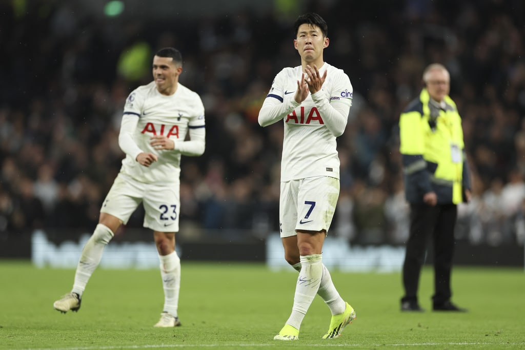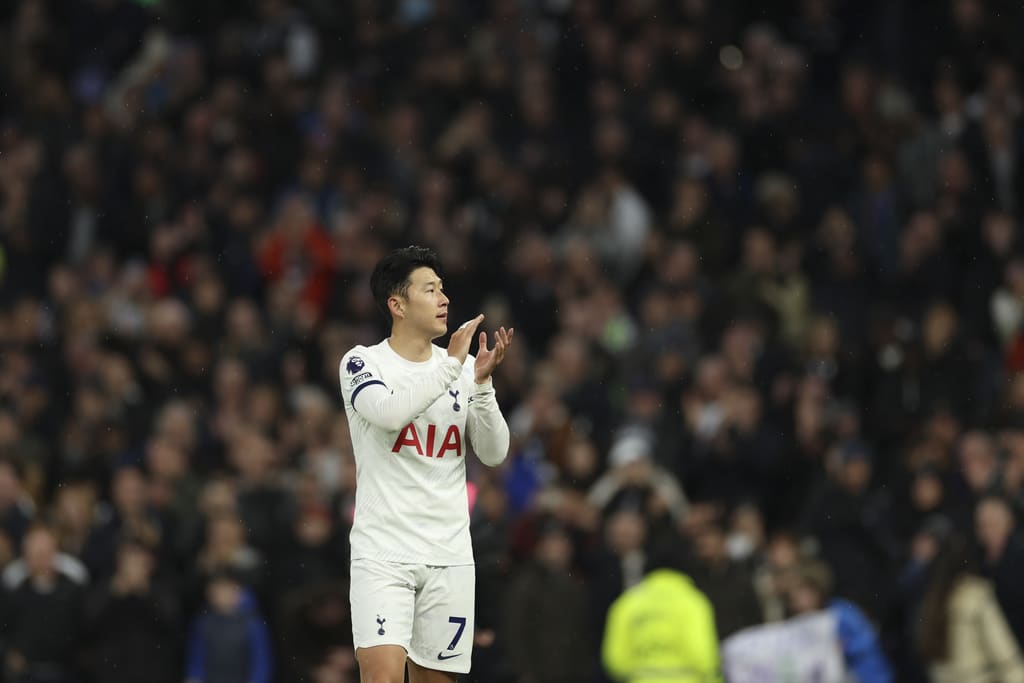 Tottenham’s Son Heung-min applauds to fans after the English Premier League soccer match between Tottenham Hotspur and Brighton & Hove Albion at the Tottenham Hotspur Stadium in London, Saturday, Feb. 10, 2024. (AP Photo/Ian Walton)