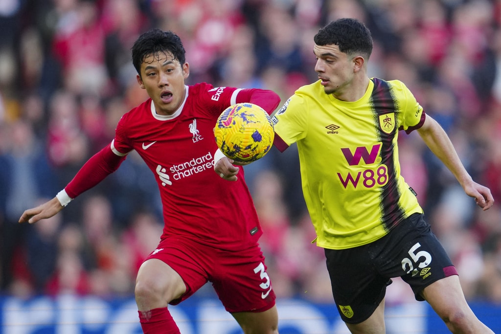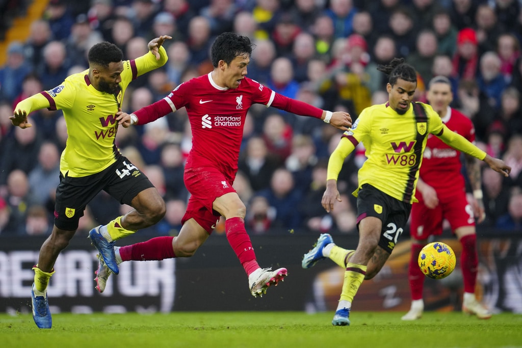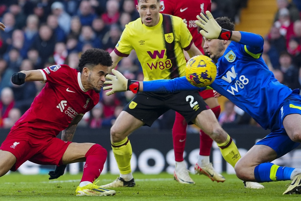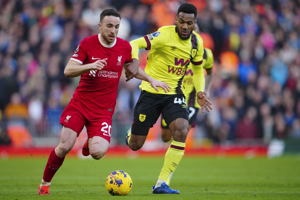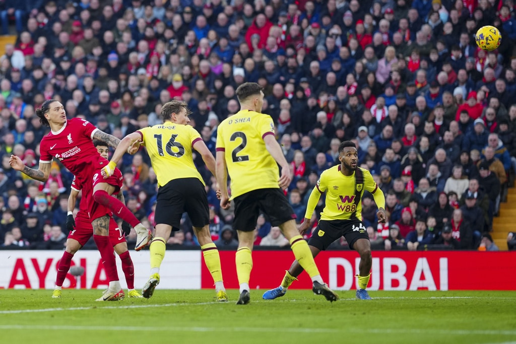 Burnley’s Dara O’Shea celebrates after scoring his side’s opening goal during the English Premier League soccer match between Liverpool and Burnley, at Anfield stadium in Liverpool, England, Saturday, Feb. 10, 2024. (AP Photo/Jon Super)Liverpool’s manager Jurgen Klopp celebrates at the end of the English Premier League soccer match between Liverpool and Burnley, at Anfield stadium in Liverpool, England, Saturday, Feb. 10, 2024. (AP Photo/Jon Super)Liverpool’s Harvey Elliott gives the thumbs up signs during the English Premier League soccer match between Liverpool and Burnley, at Anfield stadium in Liverpool, England, Saturday, Feb. 10, 2024. (AP Photo/Jon Super)Burnley’s Hannes Delcroix, left, tries to block a shot from Liverpool’s Wataru Endo, center, during the English Premier League soccer match between Liverpool and Burnley, at Anfield stadium in Liverpool, England, Saturday, Feb. 10, 2024. (AP Photo/Jon Super)Liverpool’s Darwin Nunez, left, scores his side’s third goal during the English Premier League soccer match between Liverpool and Burnley, at Anfield stadium in Liverpool, England, Saturday, Feb. 10, 2024. (AP Photo/Jon Super)Liverpool’s Wataru Endo, left, duels for the ball with Burnley’s Zeki Amdouni during the English Premier League soccer match between Liverpool and Burnley, at Anfield stadium in Liverpool, England, Saturday, Feb. 10, 2024. (AP Photo/Jon Super)Liverpool’s Diogo Jota, left, duels for the ball with Burnley’s Hannes Delcroix during the English Premier League soccer match between Liverpool and Burnley, at Anfield stadium in Liverpool, England, Saturday, Feb. 10, 2024. (AP Photo/Jon Super)Liverpool’s Curtis Jones, front, duels for the ball with Burnley’s Zeki Amdouni during the English Premier League soccer match between Liverpool and Burnley, at Anfield stadium in Liverpool, England, Saturday, Feb. 10, 2024. (AP Photo/Jon Super)Liverpool’s Luis Diaz, left, scores his side’s second goal during the English Premier League soccer match between Liverpool and Burnley, at Anfield stadium in Liverpool, England, Saturday, Feb. 10, 2024. (AP Photo/Jon Super)