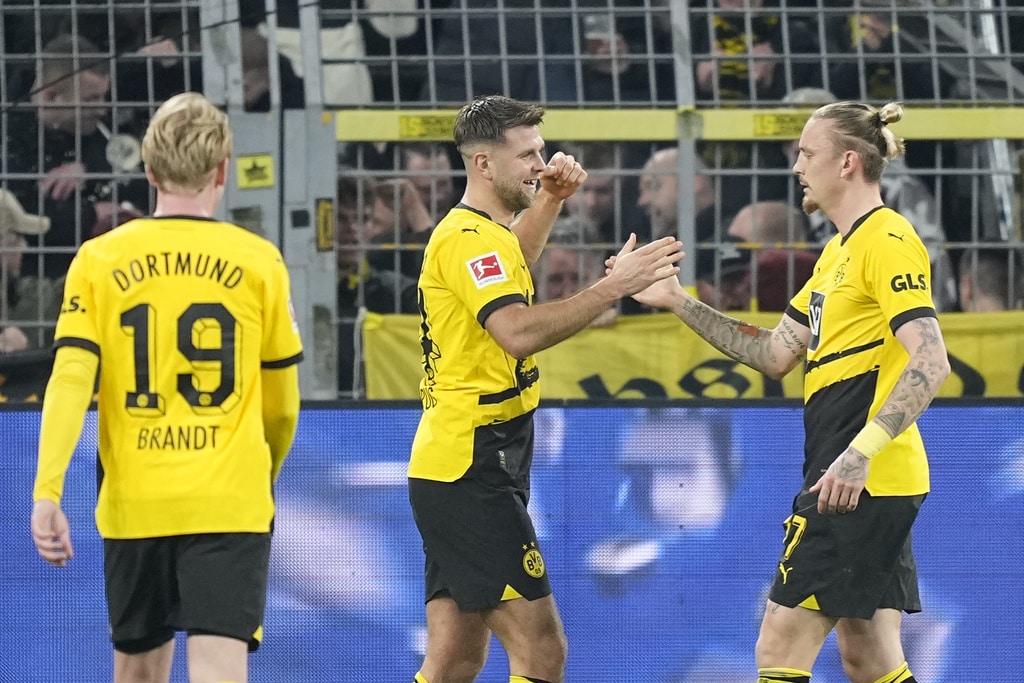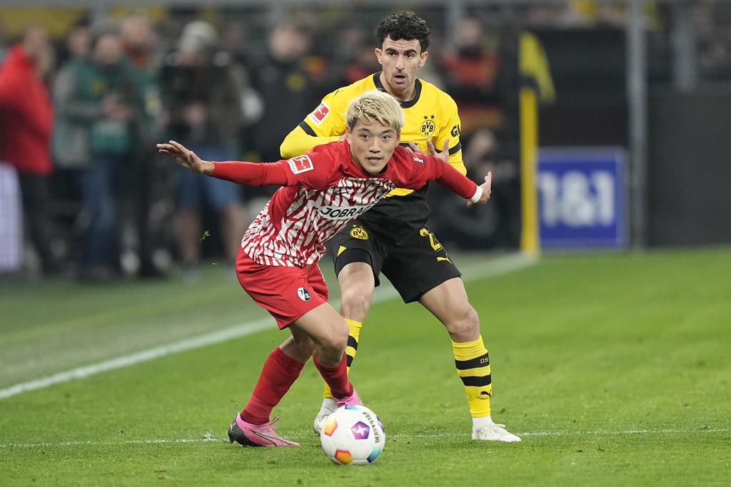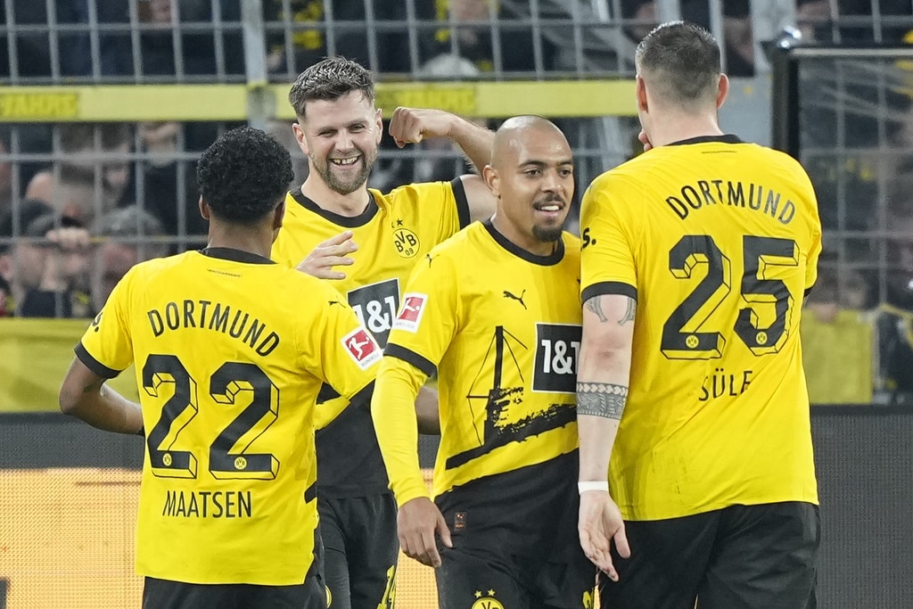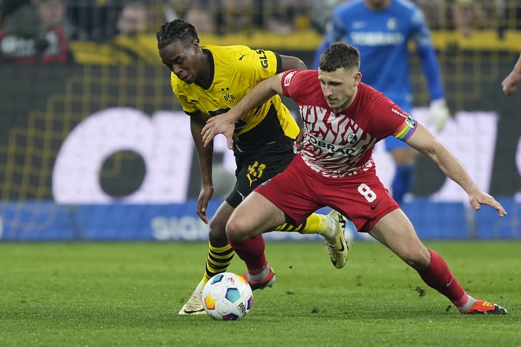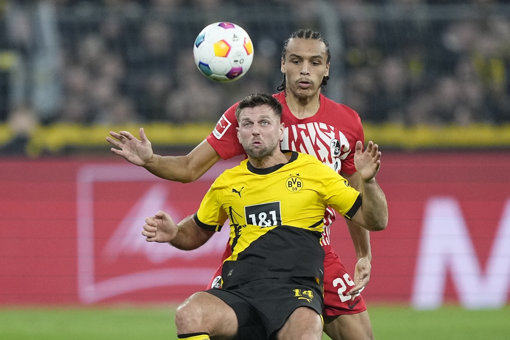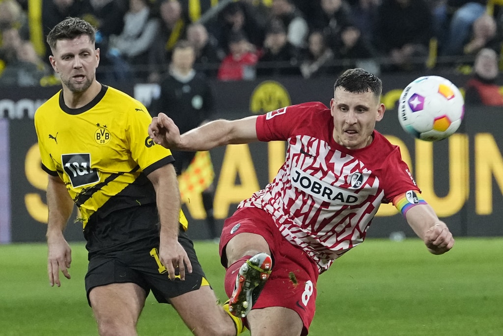 Dortmund’s Donyell Malen celebrates after scoring his side’s opening goal during the German Bundesliga soccer match between Borussia Dortmund and SC Freiburg in Dortmund, Germany, Friday, Feb. 9, 2024. (AP Photo/Martin Meissner)Freiburg’s Ritsu Doan is challenged by Dortmund’s Mateu Morey, rear, during the German Bundesliga soccer match between Borussia Dortmund and SC Freiburg in Dortmund, Germany, Friday, Feb. 9, 2024. (AP Photo/Martin Meissner)Dortmund’s Niclas Fuellkrug, centre, celebrates after scoring his side’s third goal during the German Bundesliga soccer match between Borussia Dortmund and SC Freiburg in Dortmund, Germany, Friday, Feb. 9, 2024. (AP Photo/Martin Meissner)Freiburg’s Maximilian Eggestein, right, is challenged by Dortmund’s Niclas Fuellkrug during the German Bundesliga soccer match between Borussia Dortmund and SC Freiburg in Dortmund, Germany, Friday, Feb. 9, 2024. (AP Photo/Martin Meissner)Dortmund’s Niclas Fuellkrug, left, and Dortmund’s Nico Schlotterbeck jump for a header during the German Bundesliga soccer match between Borussia Dortmund and SC Freiburg in Dortmund, Germany, Friday, Feb. 9, 2024. (AP Photo/Martin Meissner)Dortmund’s Niclas Fuellkrug is challenged by Freiburg’s Kiliann Sildillia, rear, during the German Bundesliga soccer match between Borussia Dortmund and SC Freiburg in Dortmund, Germany, Friday, Feb. 9, 2024. (AP Photo/Martin Meissner)Dortmund’s Niclas Fuellkrug is challenged by Freiburg’s Kiliann Sildillia during the German Bundesliga soccer match between Borussia Dortmund and SC Freiburg in Dortmund, Germany, Friday, Feb. 9, 2024. (AP Photo/Martin Meissner)Freiburg’s Maximilian Eggestein is challenged by Dortmund’s Jamie Bynoe-Gittens, rear, during the German Bundesliga soccer match between Borussia Dortmund and SC Freiburg in Dortmund, Germany, Friday, Feb. 9, 2024. (AP Photo/Martin Meissner)Freiburg’s Lucas Hoeler is challenged by Dortmund’s Nico Schlotterbeck, rear, during the German Bundesliga soccer match between Borussia Dortmund and SC Freiburg in Dortmund, Germany, Friday, Feb. 9, 2024. (AP Photo/Martin Meissner)