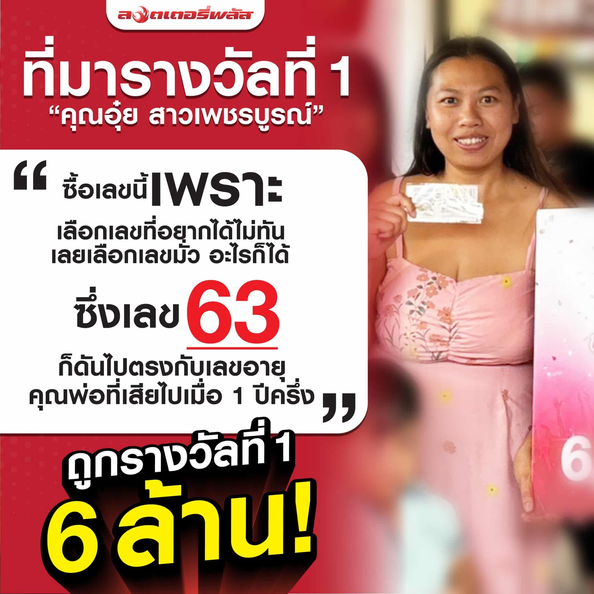 เรียกว่าเป็นเลข 63 พารวย เพราะดันไปตรงกับอายุคุณพ่อที่เพิ่งเสียไปได้ 1 ปีครึ่ง จึงตัดสินใจซื้อมาในจำนวน 25 ใบ สุดท้ายแจ็คพอตแตกถูกลอตเตอรี่ 6 ล้านบาท!