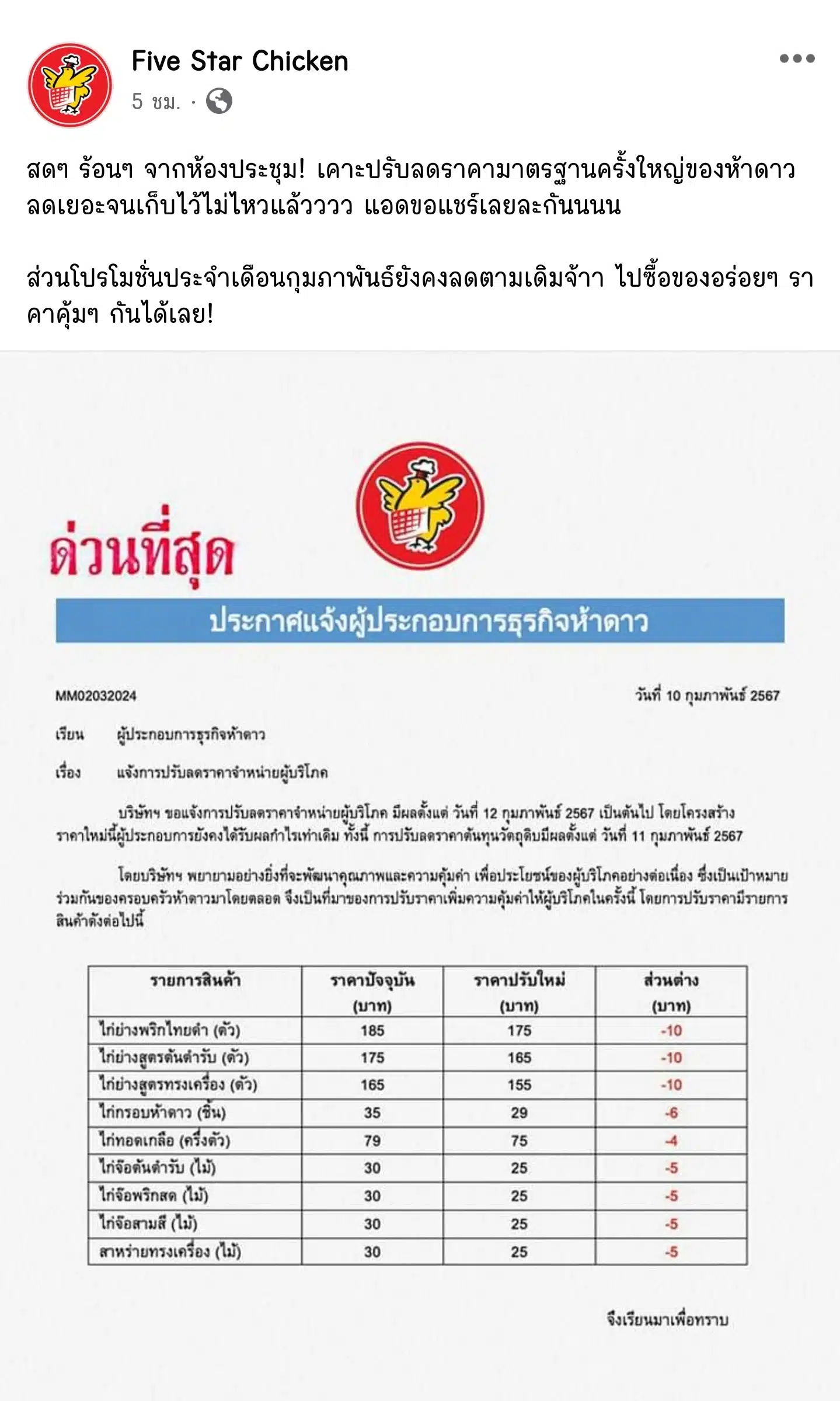 10 กุมภาพันธ์ 2567 – บริษัท ไก่ย่าห้าดาว ผู้ประกอบการธุรกิจร้านอาหารไก่ย่างชื่อดัง ประกาศปรับลดราคาอาหารครั้งใหญ่ เริ่มตั้งแต่วันที่ 12 กุมภาพันธ์ 2567 เป็นต้นไป โดยสินค้าที่ปรับลดราคามีทั้งไก่ย่าง ไก่ทอด ไก่จ๊อ และสาหร่ายทรงเครื่อง ราคาปรับลดอยู่ที่ 5-10 บาท