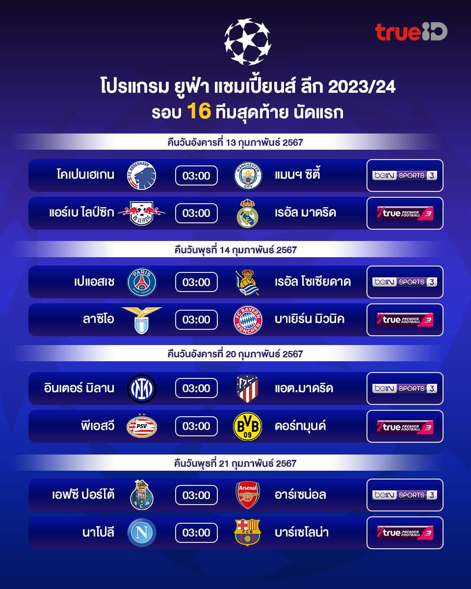 ยูฟ่า แชมเปี้ยนส์ลีก รอบ 16 ทีมสุดท้าย ประจำฤดูกาล 2023/24 แข่งขันวันที่ 13-14 กุมภาพันธ์ 2567