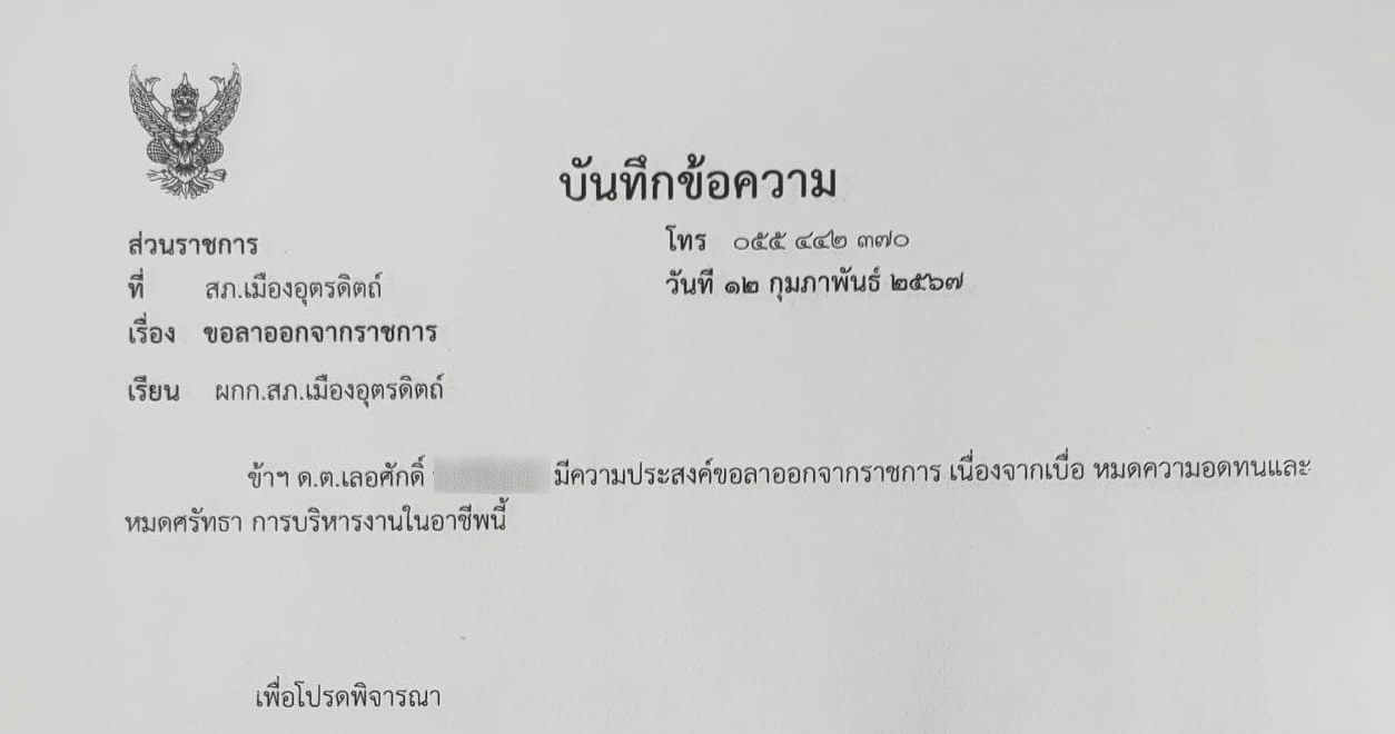 โดยในใบลาออกนั้น ระบุว่า มีความประสงค์จะลาออกจากราชการ เนื่องจากเบื่อ หมดความอดทนและหมดศรัทธา การบริหารงานในอาชีพนี้