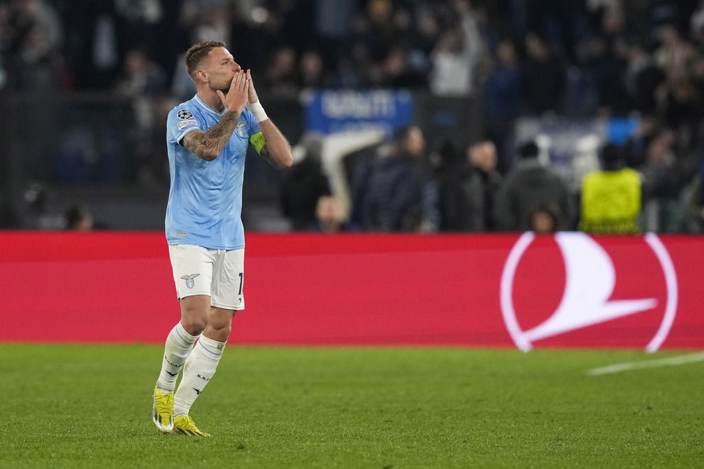 Lazio’s Ciro Immobile celebrates after scoring his side’s first goal during a Champions League round of 16 first leg soccer match between Lazio and Bayern Munich, at Rome’s Olympic Stadium, Wednesday, Feb. 14, 2024. (Alfredo Falcone/LaPresse via AP)