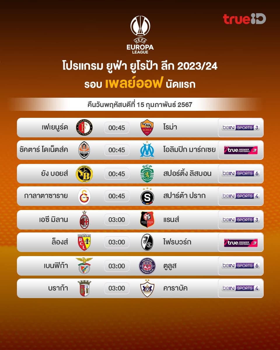 ยูโรป้า ลีก รอบเพลย์ออฟ หาทีมเข้ารอบ 16 ทีมสุดท้าย นัดแรก 2023/24 วันพฤหัสบดีที่ 15 กุมภาพันธ์ 2567