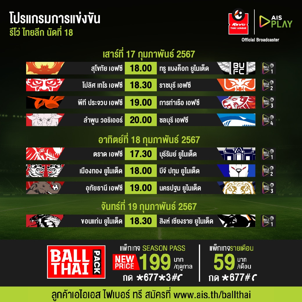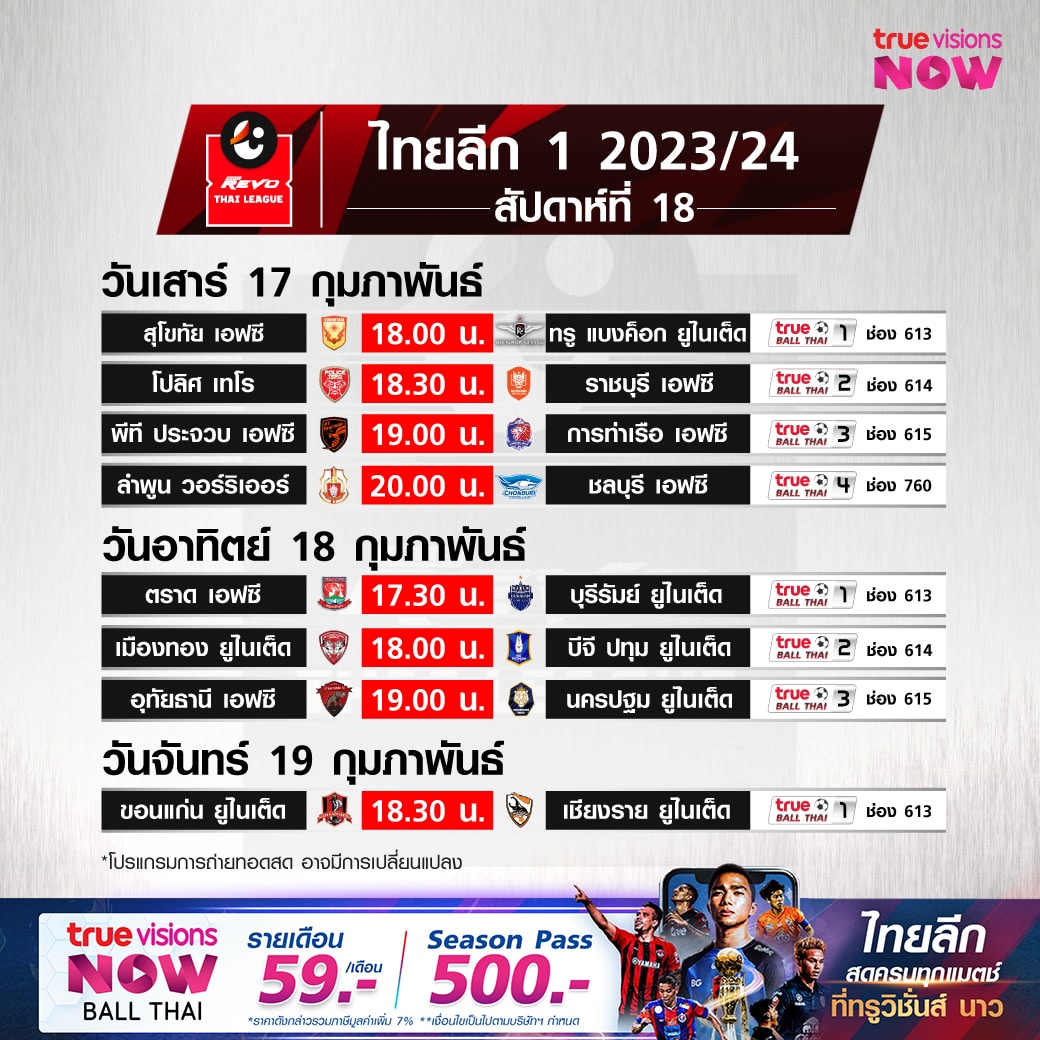 ตารางแข่งขัน รีโว่ 2023/24 ไทยลีก โปรแกรมฟุตบอลไทยลีก สัปดาห์ที่ 18 ทุกคู่ถ่ายทอดสดทาง AIS Play และ True Ball Thai