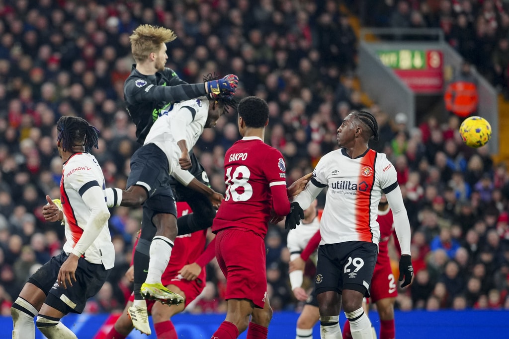 Liverpool’s goalkeeper Caoimhin Kelleher deflects the ball during the English Premier League soccer match between Liverpool and Luton Town, at Anfield stadium in Liverpool, England, Wednesday, Feb. 21, 2024. (AP Photo/Jon Super)