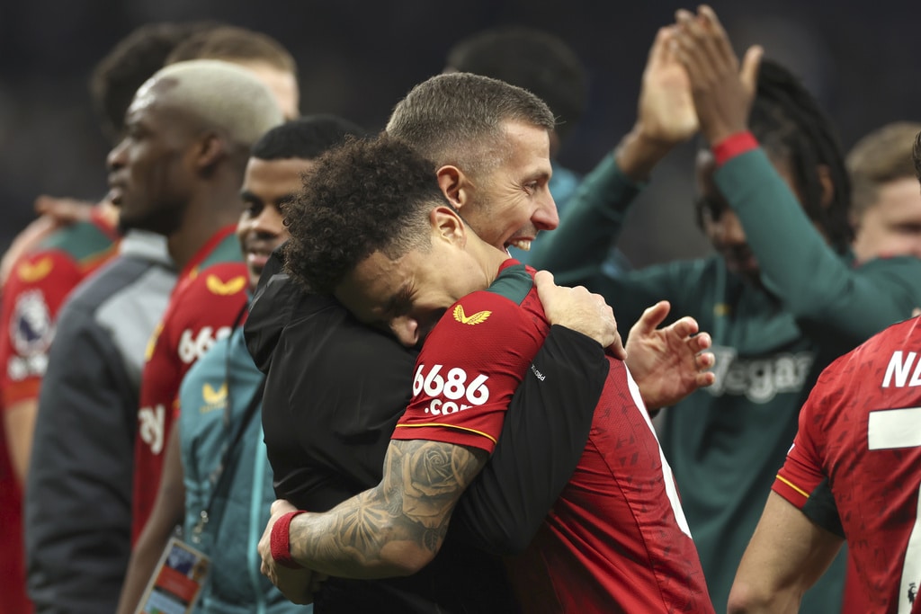 Wolverhampton Wanderers’ head coach Gary O’Neil celebrates with Wolverhampton Wanderers’ Joao Gomes their victory at the English Premier League soccer match between Tottenham Hotspur and Wolverhampton at the Tottenham Hotspur Stadium in London, Saturday, Feb. 17, 2024. (AP Photo/Ian Walton)