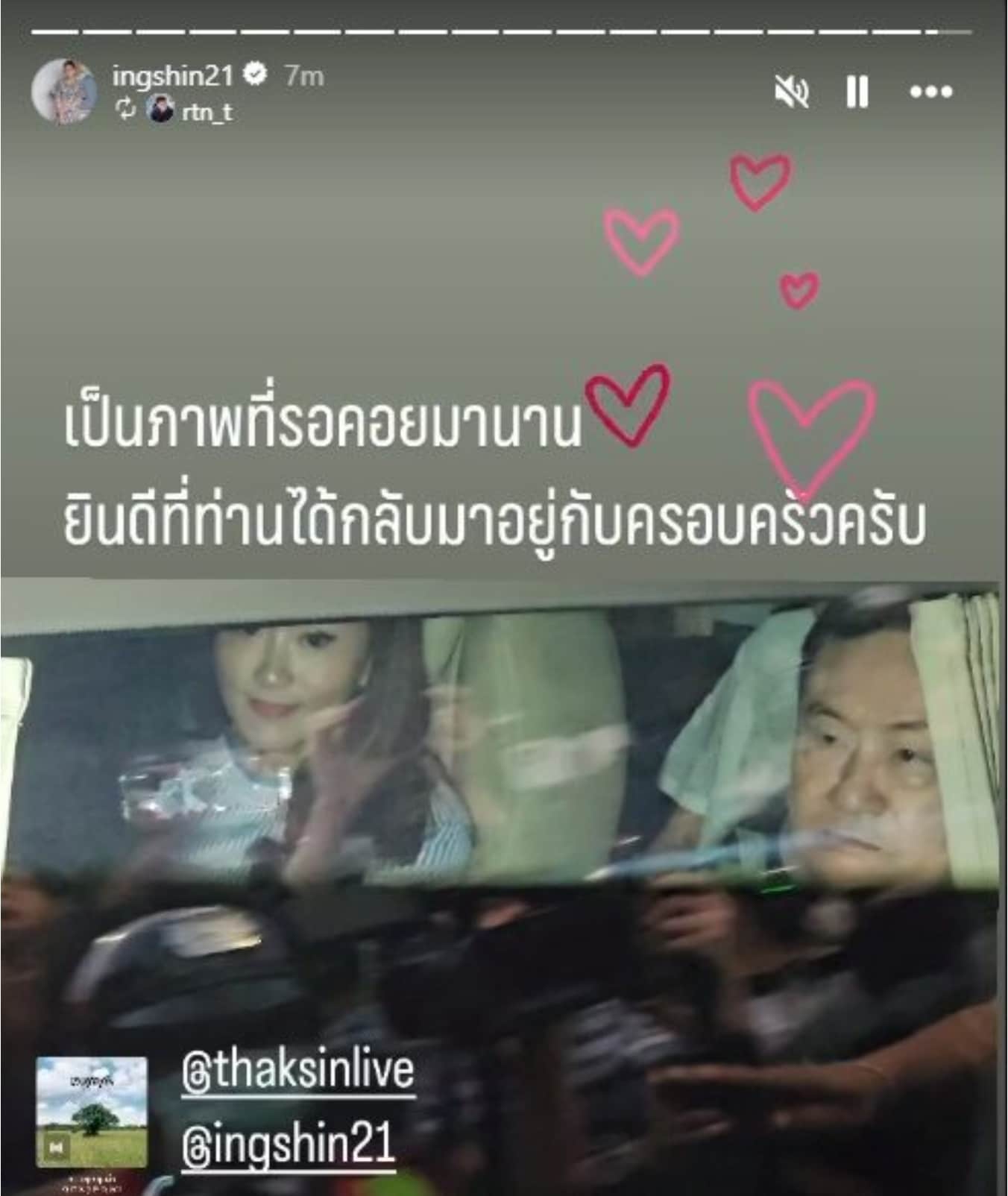 แพทองธารได้รีสตอรี่ภาพของตัวเองกับพ่อ ทักษิณ พร้อมข้อความว่า “เป็นภาพที่รอคอยมานาน ยินดีที่ท่านได้กลับมาอยู่กับครอบครัวครับ”