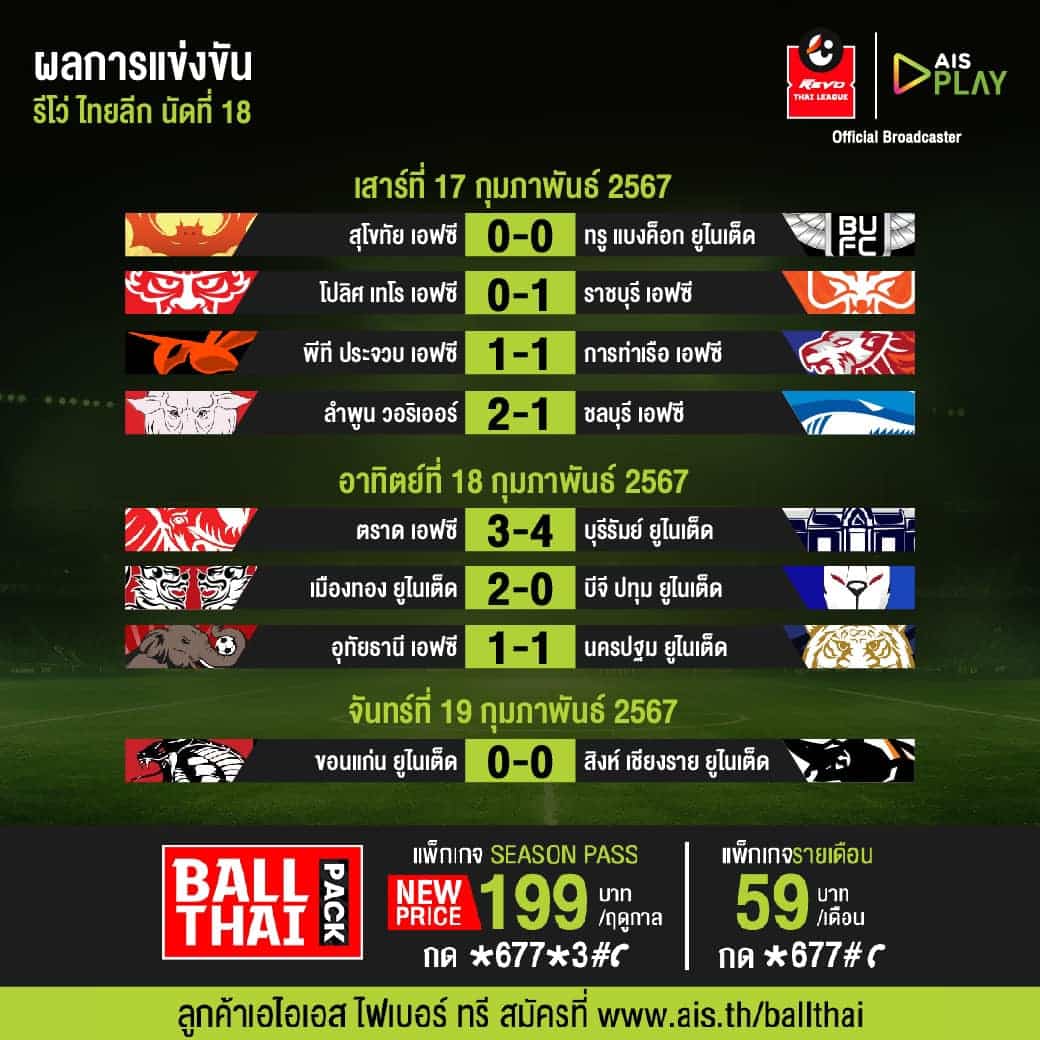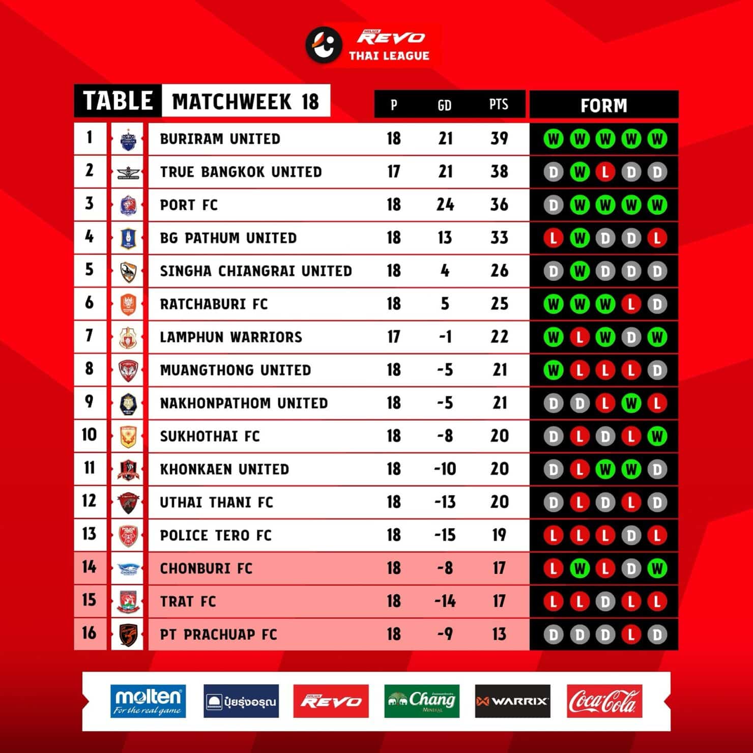 สรุปผลการแข่งขัน รีโว่ ไทยลีก 2023/24 หลังจบนัดที่ 18