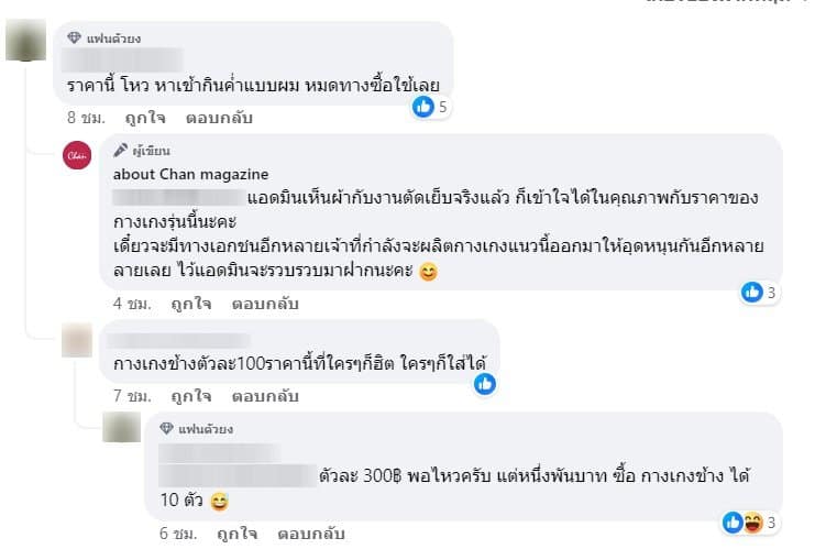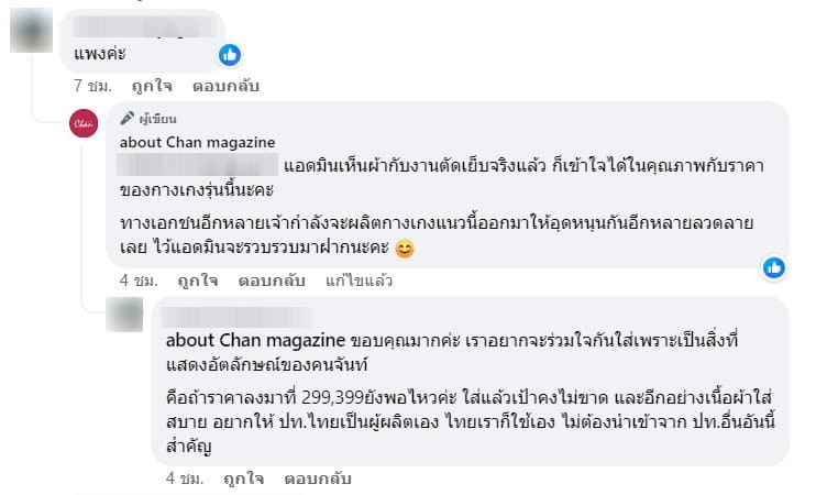 ขณะที่แอดมินเพจ about Chan magazine ได้ตอบกลับความเห็นของผู้ใช้เฟซบุ๊ก ยืนยันคุณภาพของเนื้อผ้าดีสมราคา พร้อมฝากว่า ในอนาคตทางเอกชนจะมีกางเกงลายประจำจังหวัดออกมาให้ประชาชนได้อุดหนุนกันอีกหลายแบบ