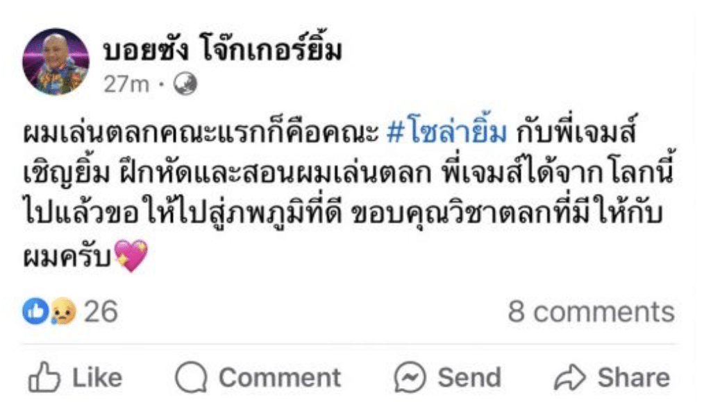 เฟซบุ๊ก บอยซัง โจ๊กเกอร์ยิ้ม ได้เขียนข้อความว่า “ผมเล่นตลกคณะแรกก็คือคณะ โซล่ายิ้ม กับพี่เจมส์ เชิญยิ้ม ฝึกหัดและสอนผมเล่นตลก พี่เจมส์ได้จากโลกนี้ไปแล้ว ข้อให้ไปสู่ภพภูมิที่ดี ขอบคุณวิชาตลกที่มีให้กับผมครับ”