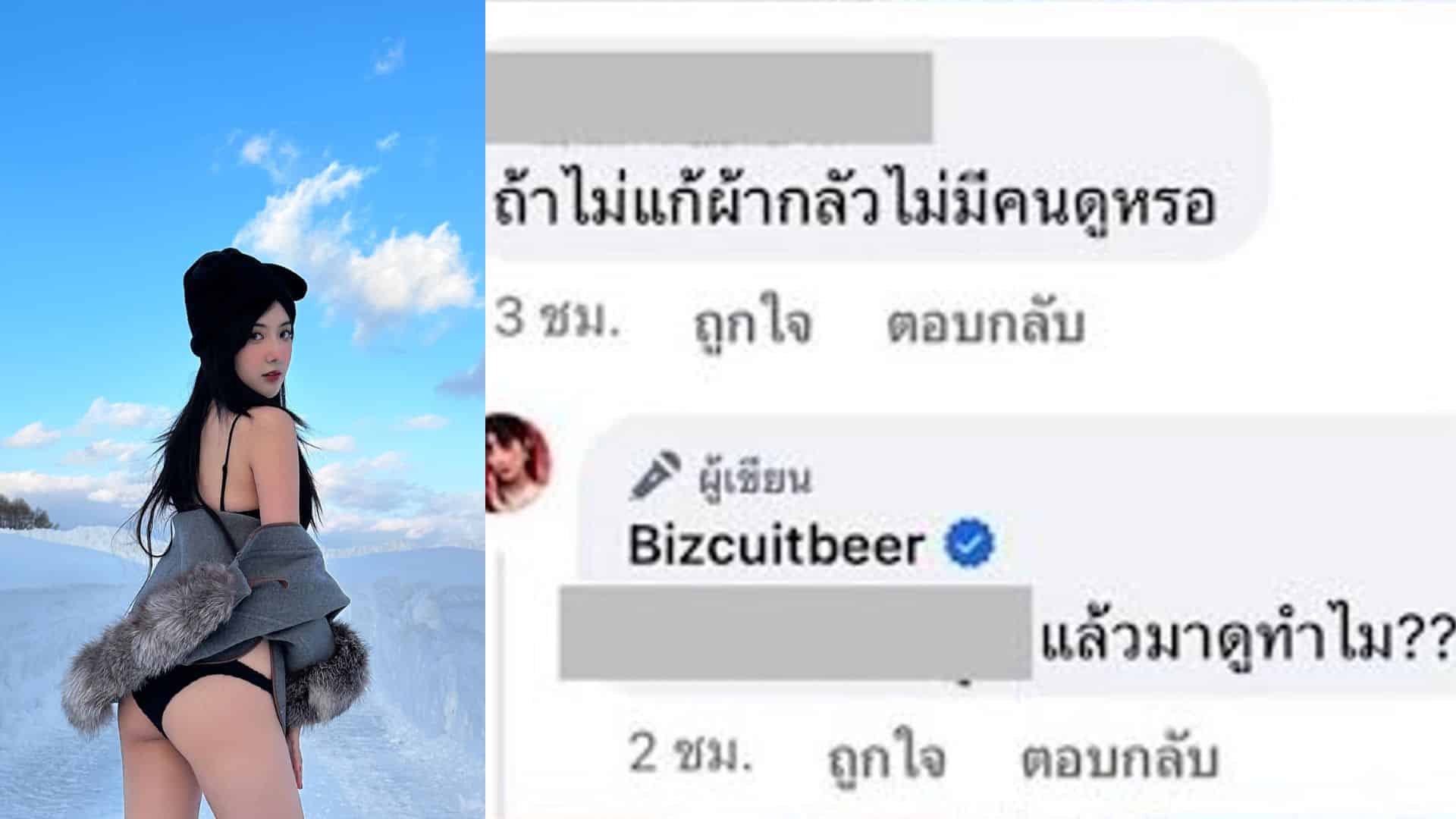 งานนี้ดูเหมือนจะไม่มีอะไร แต่กลับกลายเป็นประเด็นร้อนทันที เมื่อมีชาวเน็ตรายหนึ่ง โผล่คอมเมนต์ถามแรง ว่า “ถ้าไม่แก้ผ้ากลัวไม่มีคนดูหรอ” ก่อนเจอสาวเบียร์ฉุนใส่ ตอบกลับไปทันควันว่า “แล้วมาดูทำไม??”