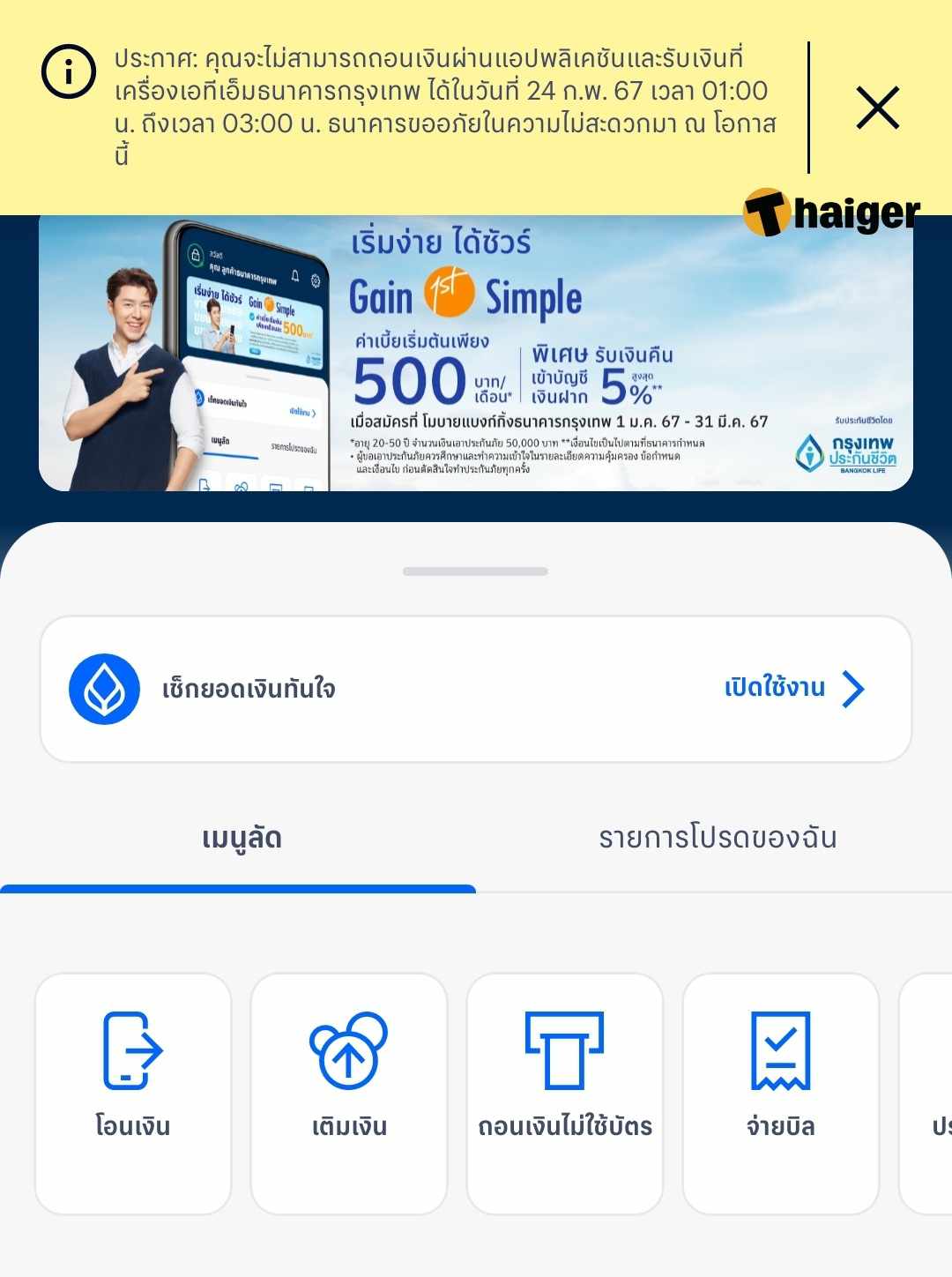 “คุณจะไม่สามารถถอนเงินผ่านแอปพลิเคชั่นและรับเงินที่เครื่องเอทีเอ็มธนาคารกรุงเทพ ได้ในวันที่ 24 ก.พ. 67เวลา 01.00 น. ถึงเวลา 03.00 น. ธนาคารขออภัยในความไม่สะดวกมา ณ โอกาสนี้”