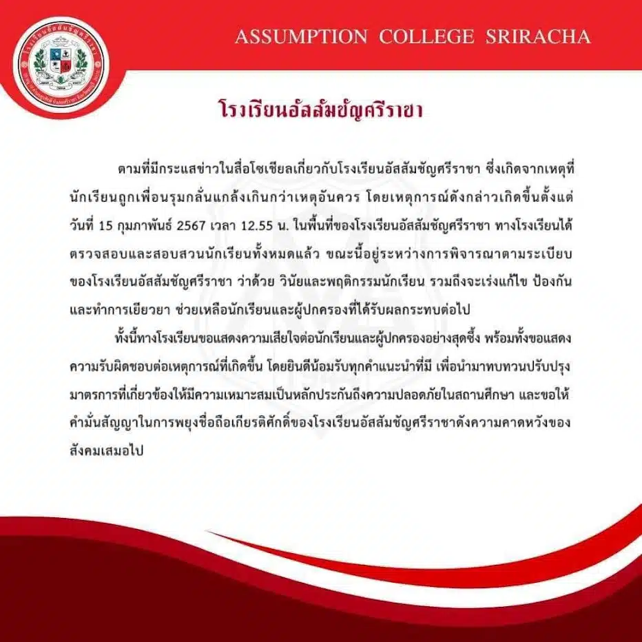 ล่าสุด โรงเรียมอัสสัมชัญศรีราชา ได้ออกเอกสารชี้แจงถึงประเด็นดังกล่าว โดยระบุว่า “ตามที่มีกระแสข่าวในสื่อโซเชียลเกี่ยวกับโรงเรียนอัสสัมชัญศรีราชา ซึ่งเกิดจากเหตุที่ นักเรียนถูกเพื่อนรุมกลั่นแกล้งเกินกว่าเหตุอันควร โดยเหตุการณ์ดังกล่าวเกิดขึ้นตั้งแต่ วันที่ 15 กุมภาพันธ์ 2567 เวลา 12.55 น. ในพื้นที่ของโรงเรียนอัสสัมชัญศรีราชา ทางโรงเรียนได้ ตรวจสอบและสอบสวนนักเรียนทั้งหมดแล้ว ขณะนี้อยู่ระหว่างการพิจารณาตามระเบียบ ของโรงเรียนอัสสัมชัญศรีราชา ว่าด้วย วินัยและพฤติกรรมนักเรียน รวมถึงจะเร่งแก้ไข ป้องกัน และทำการเยียวยา ช่วยเหลือนักเรียนและผู้ปกครองที่ได้รับผลกระทบต่อไป