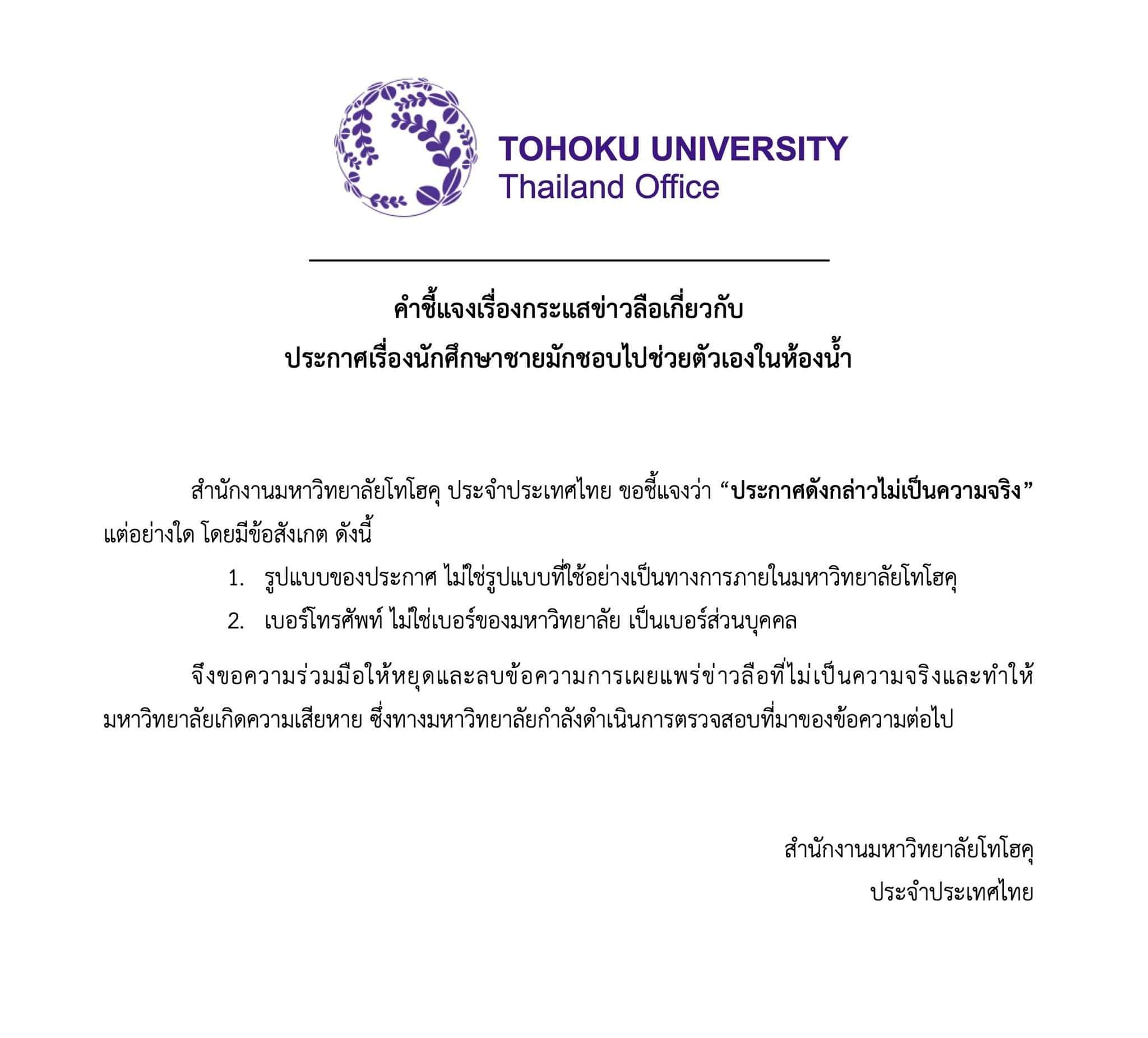 “สํานักงานมหาวิทยาลัยโทโฮคุ ประจําประเทศไทย ขอชี้แจงว่า “ประกาศดังกล่าวไม่เป็นความจริง” แต่อย่างใด โดยมีข้อสังเกต ดังนี้