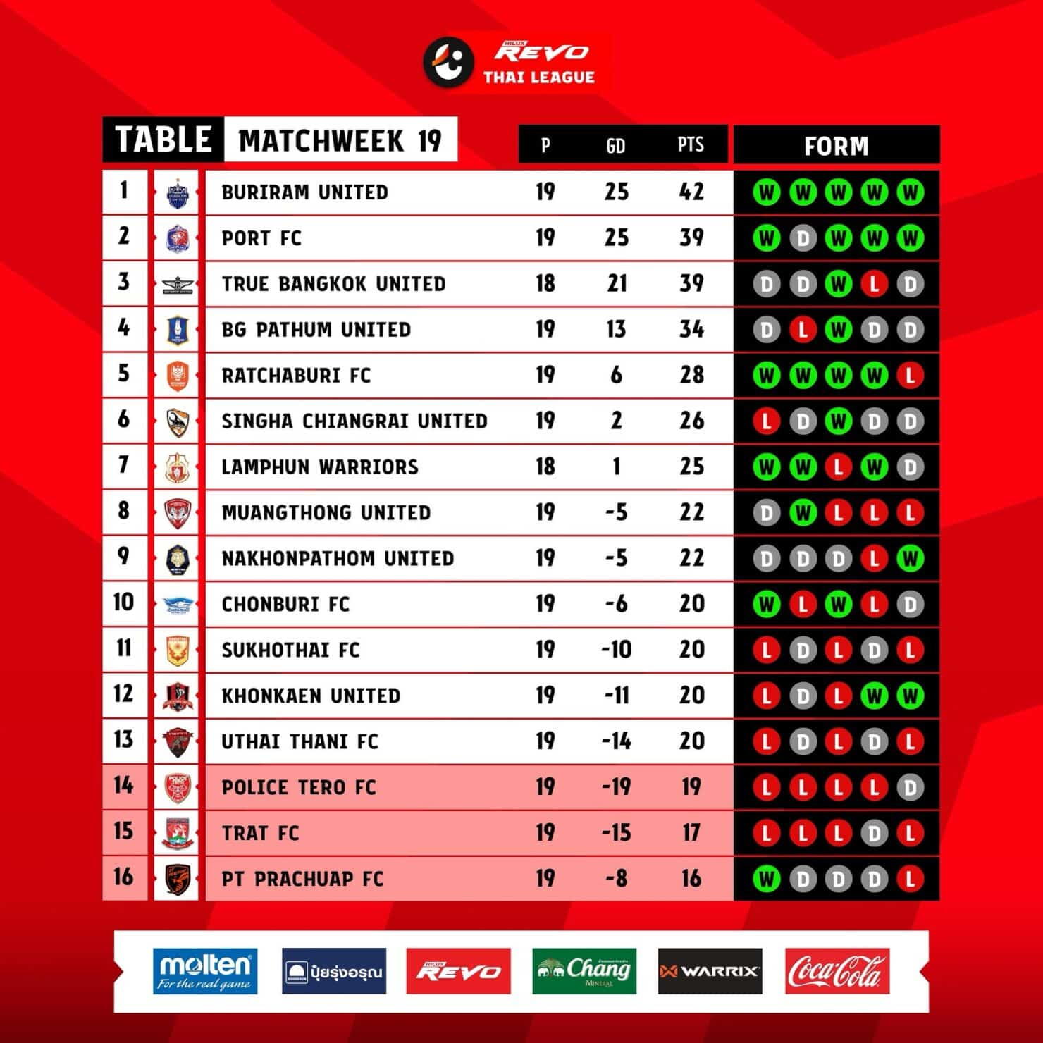 สรุปผลการแข่งขัน รีโว่ ไทยลีก 2023/24 หลังจบนัดที่ 19