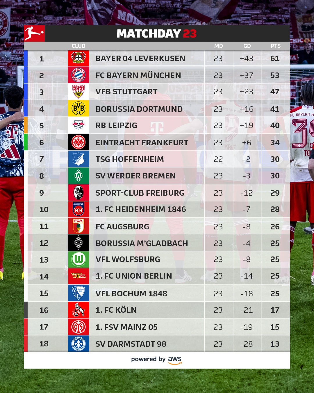 อันดับ ตารางคะแนน บุนเดสลีกา เยอรมัน 2023/24 หลังจบแมตซ์เดย์ที่ 23 โดย 5 อันดับเป็นไปตามลำดับมีดังนี้ (อัปเดตวันที่ 26 กุมภาพันธ์ 2567)