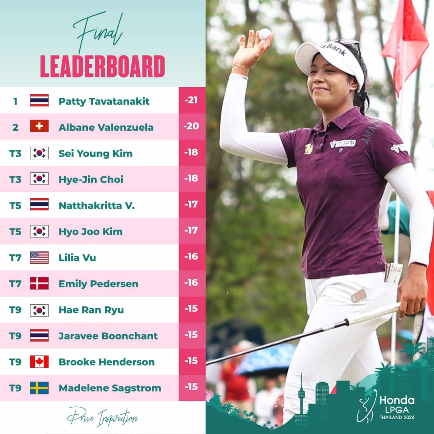 แพตตี้ ปภังกร ธวัชธนกิจ นักกอล์ฟสาวน้อยวัย 24 ปี เก็บเพิ่ม 5 อันเดอร์พาร์ กลายเป็นนักกอล์ฟไทยคนที่สองที่คว้าแชมป์รายการฮอนด้า แอลพีจีเอ ไทยแลนด์ ได้สำเร็จ