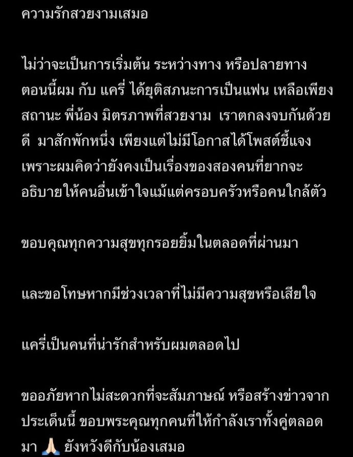 “ความรักสวยงามเสมอ ไม่ว่าจะเป็นการเริ่มต้น ระหว่างทาง หรือปลายทาง ตอนนี้ผม กับ แครี่ ได้ยุติสถานะการเป็นแฟน เหลือเพียงสถานะ พี่น้อง มิตรภาพที่สวยงาม เราตกลงจบกันด้วยดีมาสักพักหนึ่ง เพียงแต่ไม่มีโอกาสได้โพสต์ชี้แจง เพราะผมคิดว่ายังคงเป็นเรื่องของคนสองคนที่ยากจะอธิบายให้คนอื่นเข้าใจ แม้แต่ครอบครัวหรือคนใกล้ตัว