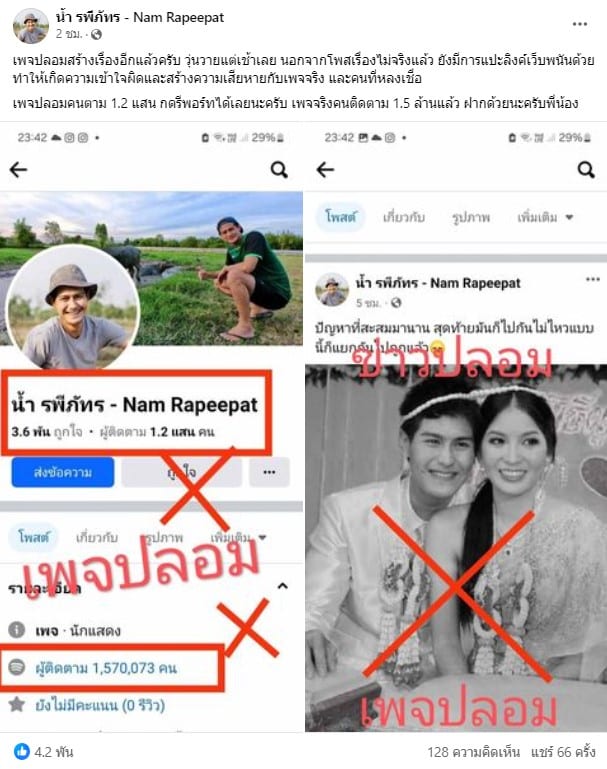 น้ำ รพีภัทร แจงดราม่าเลิกภรรยา ‘ไม่เป็นความจริง’ หลังเพจปลอมปล่อยข่าวมั่ว จนสื่อ-แฟนคลับพากันหลงเชื่อ ด้าน มินตรา ภรรยา โพสต์ย้ำ เพจจริงไม่มีโปรโมตเว็บพนัน และต้องมีผู้ติดตาม 1.5 ล้าน เท่านั้น