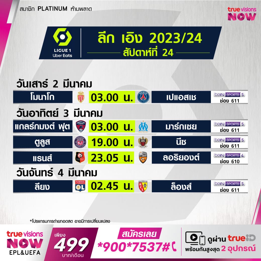 ตารางแข่งขัน ลีกเอิง ฝรั่งเศส โปรแกรมฟุตบอล ลีกเอิง 2023/24 สัปดาห์ที่ 24 ถ่ายทอดสดทาง beIN Sports และ True Sports
