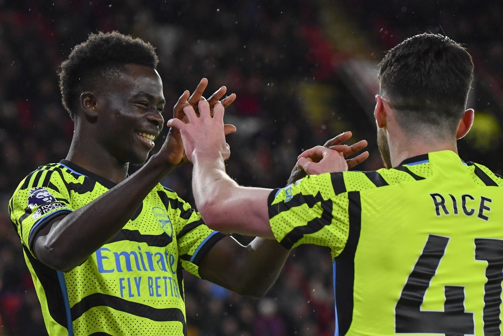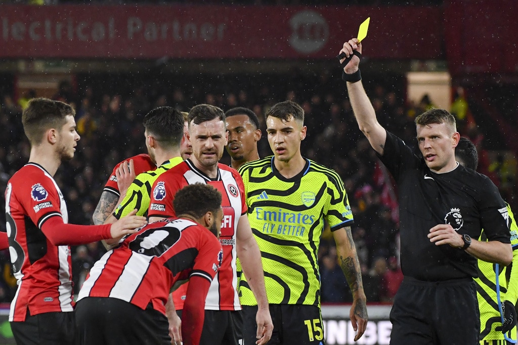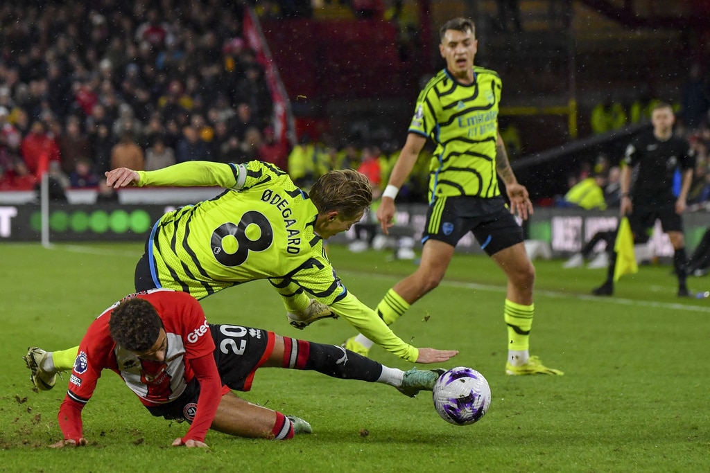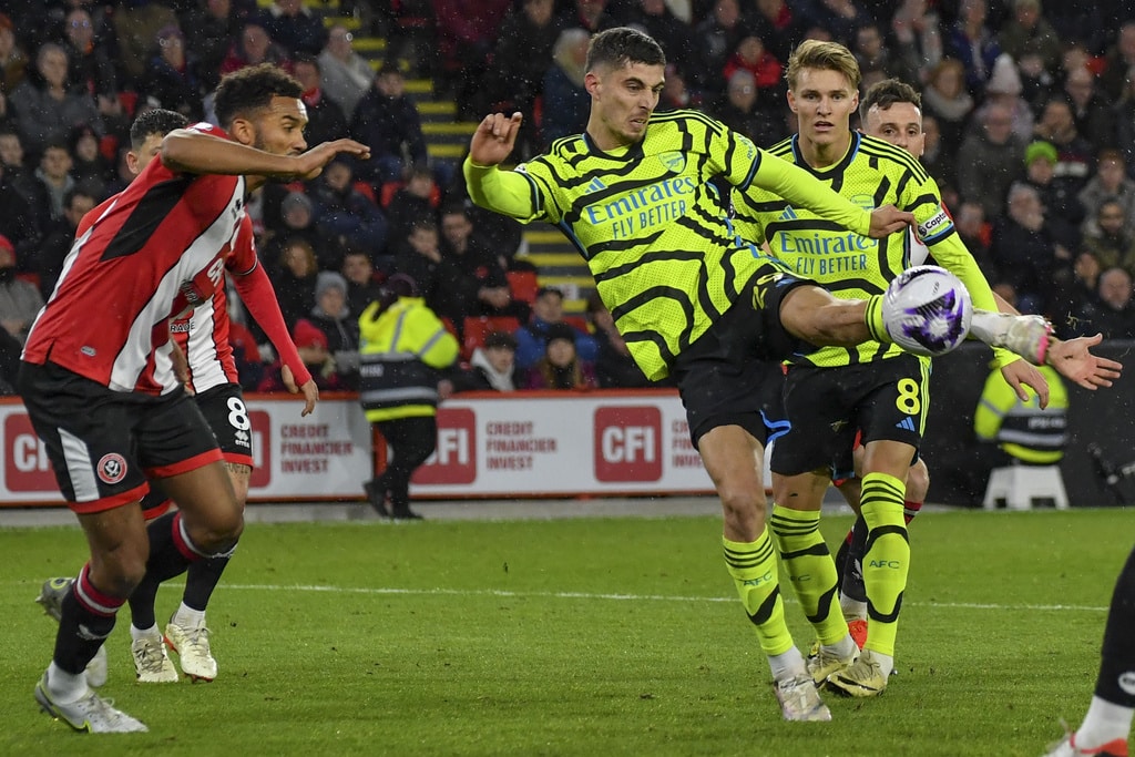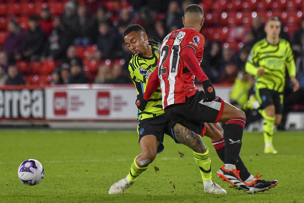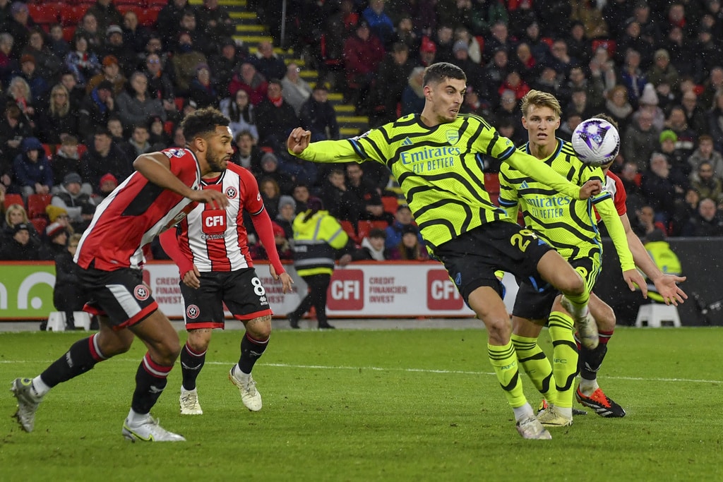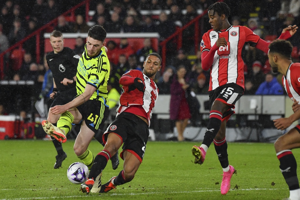 Arsenal’s Bukayo Saka, left, and Arsenal’s Declan Rice celebrate after Sheffield United’s Jayden Bogle scores an own goal past his goalkeeper during the English Premier League soccer match between Sheffield United and Arsenal at the Bramall Lane stadium in Sheffield, England, Monday, March 4, 2024. (AP Photo/Rui Vieira)Arsenal’s Declan Rice celebrates after scoring his side’s fifth goal during the English Premier League soccer match between Sheffield United and Arsenal at the Bramall Lane stadium in Sheffield, England, Monday, March 4, 2024. (AP Photo/Rui Vieira)Arsenal’s Gabriel Jesus, left, duels for the ball with Sheffield United’s Vinicius Souza during the English Premier League soccer match between Sheffield United and Arsenal at the Bramall Lane stadium in Sheffield, England, Monday, March 4, 2024. (AP Photo/Rui Vieira)Sheffield United’s Vinicius Souza, second left, tries to block a shot from Arsenal’s Declan Rice, left, during the English Premier League soccer match between Sheffield United and Arsenal at the Bramall Lane stadium in Sheffield, England, Monday, March 4, 2024. (AP Photo/Rui Vieira)Arsenal’s Declan Rice celebrates after scoring his side’s fifth goal during the English Premier League soccer match between Sheffield United and Arsenal at the Bramall Lane stadium in Sheffield, England, Monday, March 4, 2024. (AP Photo/Rui Vieira)Referee Sam Barrott shows a yellow card to Sheffield United’s Jayden Bogle during the English Premier League soccer match between Sheffield United and Arsenal at the Bramall Lane stadium in Sheffield, England, Monday, March 4, 2024. (AP Photo/Rui Vieira)Arsenal’s Martin Odegaard, top, duels for the ball with Sheffield United’s Jayden Bogle during the English Premier League soccer match between Sheffield United and Arsenal at the Bramall Lane stadium in Sheffield, England, Monday, March 4, 2024. (AP Photo/Rui Vieira)Arsenal’s Kai Havertz, right, scores his side’s fourth goal during the English Premier League soccer match between Sheffield United and Arsenal at the Bramall Lane stadium in Sheffield, England, Monday, March 4, 2024. (AP Photo/Rui Vieira)Arsenal’s Kai Havertz, right, scores his side’s fourth goal during the English Premier League soccer match between Sheffield United and Arsenal at the Bramall Lane stadium in Sheffield, England, Monday, March 4, 2024. (AP Photo/Rui Vieira)
