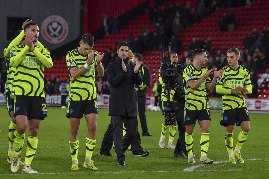 Arsenal’s manager Mikel Arteta, center, and players greet fans at the end of the English Premier League soccer match between Sheffield United and Arsenal at the Bramall Lane stadium in Sheffield, England, Monday, March 4, 2024. (AP Photo/Rui Vieira)