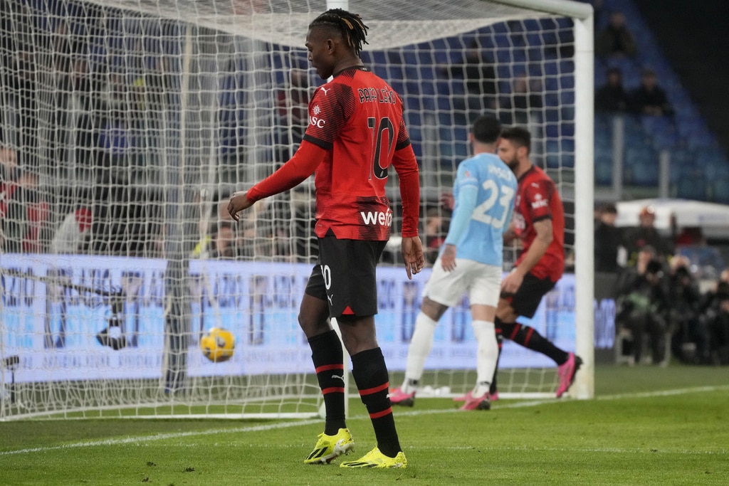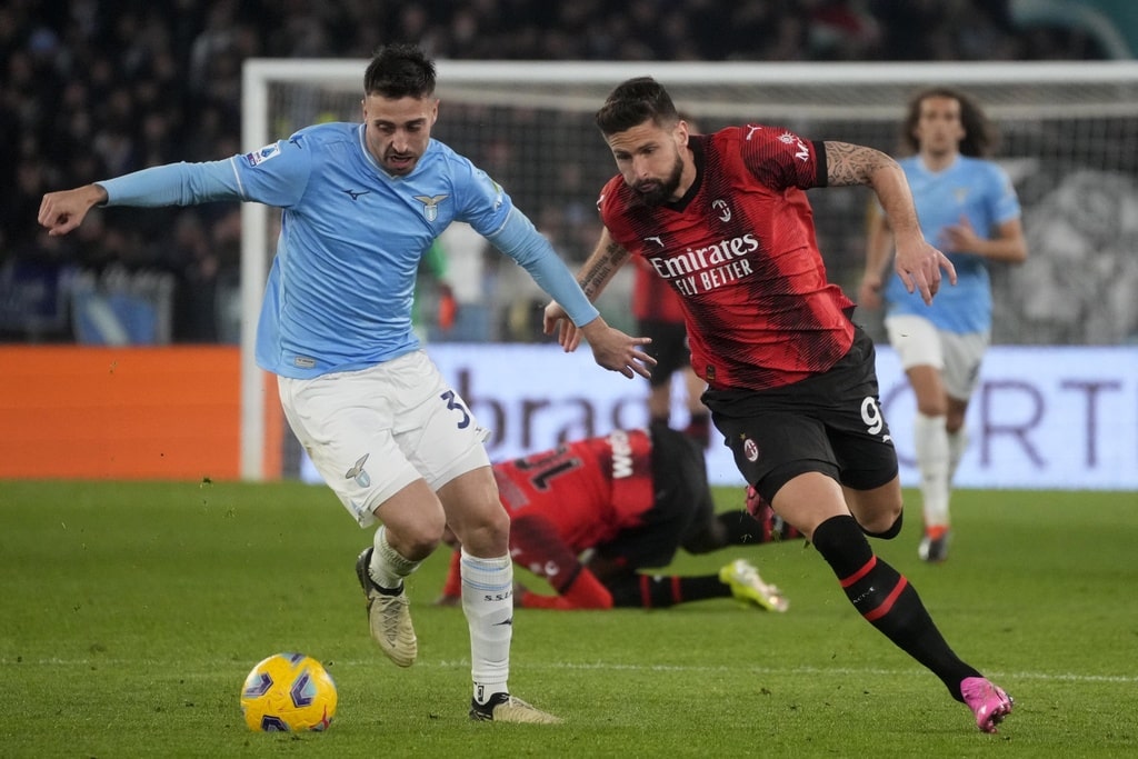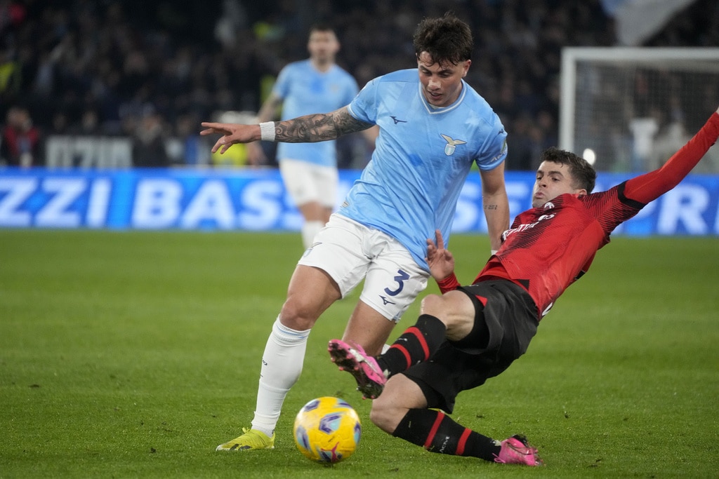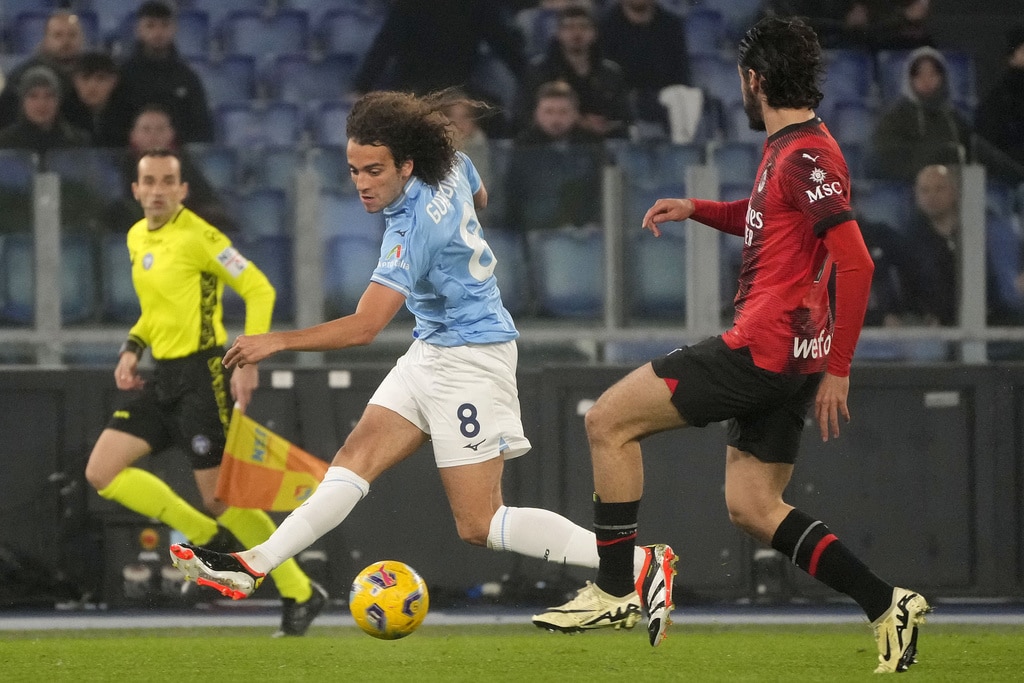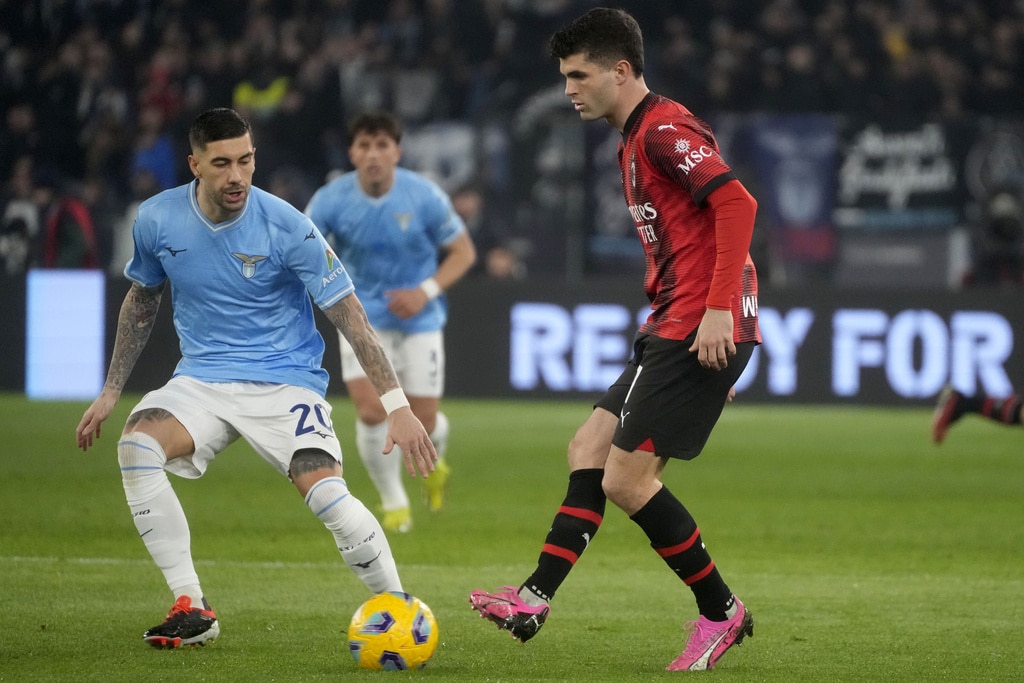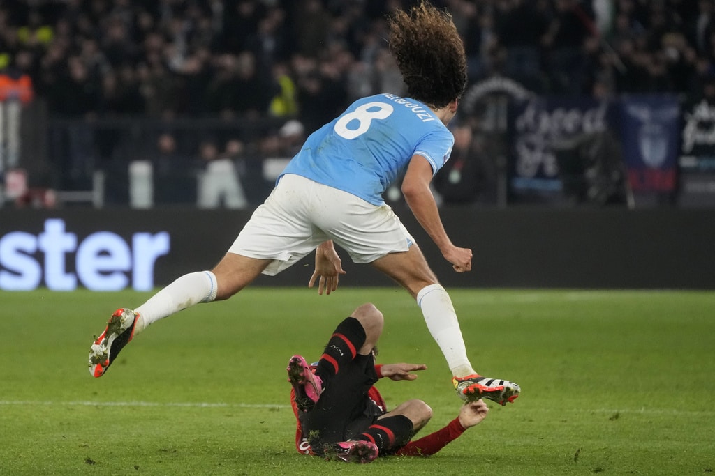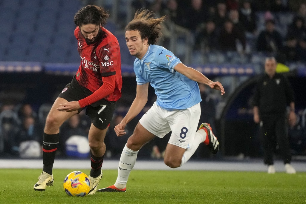 Lazio’s Matteo Guendouzi, left, and AC Milan’s Yacine Adli vie for the ball during the Italian Serie A soccer match between Lazio and Milan at Rome’s Olympic stadium, Friday, March 1, 2024. (AP Photo/Gregorio Borgia)AC Milan’s Christian Pulisic, left, and Lazio’s Matteo Guendouzi fall during the Italian Serie A soccer match between Lazio and Milan at Rome’s Olympic stadium, Friday, March 1, 2024. (AP Photo/Gregorio Borgia)Referee Marco di Bello shows the red card to Lazio’s Matteo Guendouzi, background right, and the yellow card to AC Milan’s Christian Pulisic during the Italian Serie A soccer match between Lazio and Milan at Rome’s Olympic stadium, Friday, March 1, 2024. (AP Photo/Gregorio Borgia)AC Milan’s Noah Okafor, left, and Lazio’s Felipe Anderson vie for the ball during the Italian Serie A soccer match between Lazio and Milan at Rome’s Olympic stadium, Friday, March 1, 2024. (AP Photo/Gregorio Borgia)AC Milan’s Rafael Leao reacts during the Italian Serie A soccer match between Lazio and Milan at Rome’s Olympic stadium, Friday, March 1, 2024. (AP Photo/Gregorio Borgia)Lazio’s Mario Gila, left, and AC Milan’s Olivier Giroud vie for the ball during the Italian Serie A soccer match between Lazio and Milan at Rome’s Olympic stadium, Friday, March 1, 2024. (AP Photo/Gregorio Borgia)Lazio’s Luca Pellegrini, left, and AC Milan’s Christian Pulisic vie for the ball during the Italian Serie A soccer match between Lazio and Milan at Rome’s Olympic stadium, Friday, March 1, 2024. (AP Photo/Gregorio Borgia)AC Milan’s Yacine Adli, left, and Lazio’s Matteo Guendouzi vie for the ball during the Italian Serie A soccer match between Lazio and Milan at Rome’s Olympic stadium, Friday, March 1, 2024. (AP Photo/Gregorio Borgia)AC Milan’s Christian Pulisic, right, and Lazio’s Mattia Zaccagni vie for the ball during the Italian Serie A soccer match between Lazio and Milan at Rome’s Olympic stadium, Friday, March 1, 2024. (AP Photo/Gregorio Borgia)