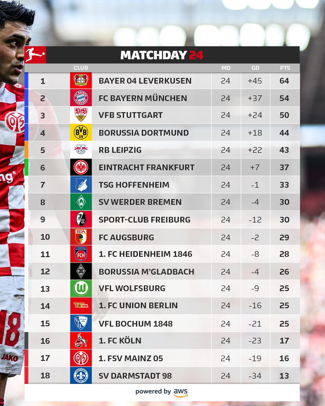 อันดับ ตารางคะแนน บุนเดสลีกา เยอรมัน 2023/24 หลังจบแมตซ์เดย์ที่ 24 โดย 5 อันดับเป็นไปตามลำดับมีดังนี้ (อัปเดตวันที่ 4 มีนาคม 2567)