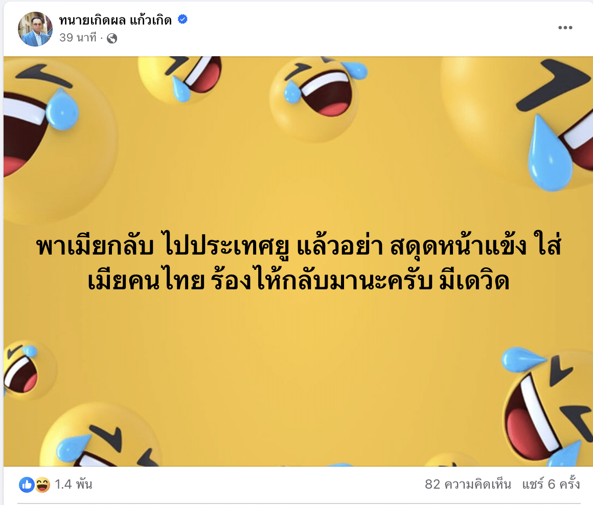 นอกจากนี้ ทนายคนดังยังระบุเพิ่มอีกว่า “หอบเมียกลับบ้านไปด้วยเลยครับ” “พาเมียกลับ ไปประเทศยู แล้วอย่า สดุดหน้าแข้ง ใส่เมียคนไทย ร้องไห้กลับมานะครับ มีเดวิด”