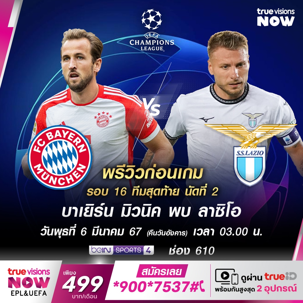 5 มีนาคม 2567 เวลา 03.00 น. ถ่ายทอดสด ดูบอลสด ฟุตบอล ยูฟ่า แชมเปี้ยนส์ลีก ฤดูกาล 2023/24 รอบ 16 ทีมสุดท้าย นัดสอง ที่สนาม อัลลิอันซ์ อารีน่า : บาเยิร์น มิวนิค จะลงเล่นพบกับ ลาซิโอ The Thaiger พาไปวิเคราะห์เกม พร้อมการทำนายผล และคาดการณ์ 11 ตัวจริงได้ที่นี่