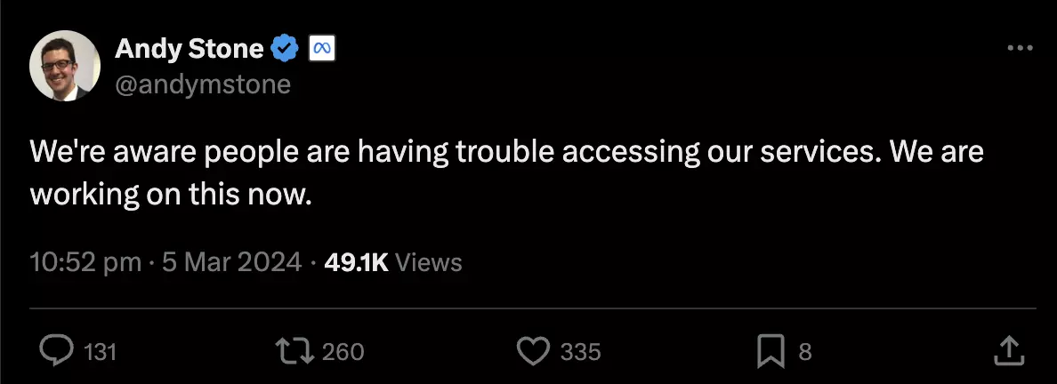 แอนดี สโตน หัวหน้าฝ่ายสื่อสารของเมตา ระบุว่า “เรารับทราบแล้วว่าผู้คนมีปัญหาในการใช้งานบริการของเรา เรากำลังเร่งดำเนินการแก้ไขเรื่องนี้อยู่”