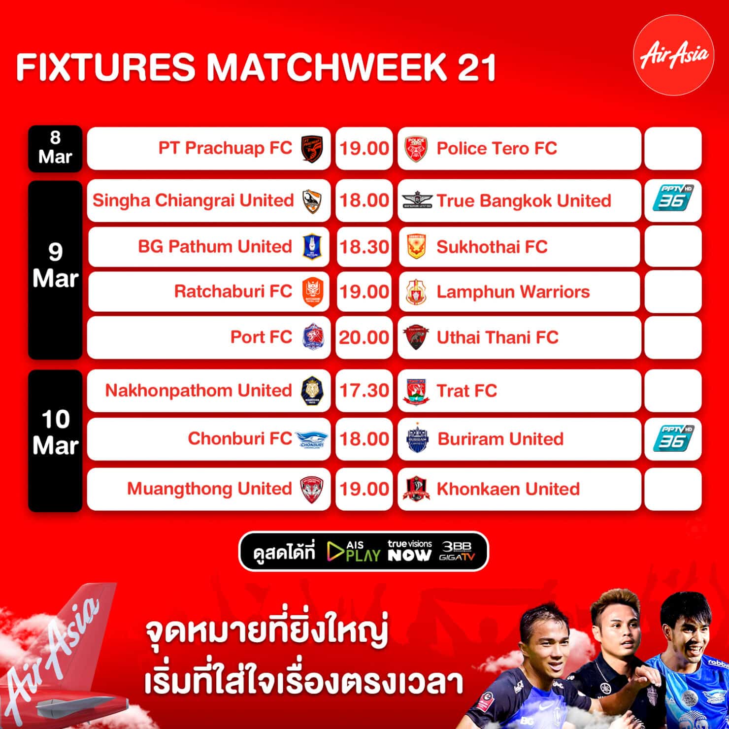 - 18:00 ชลบุรี เอฟซี พบ บุรีรัมย์ ยูไนเต็ด PPTV