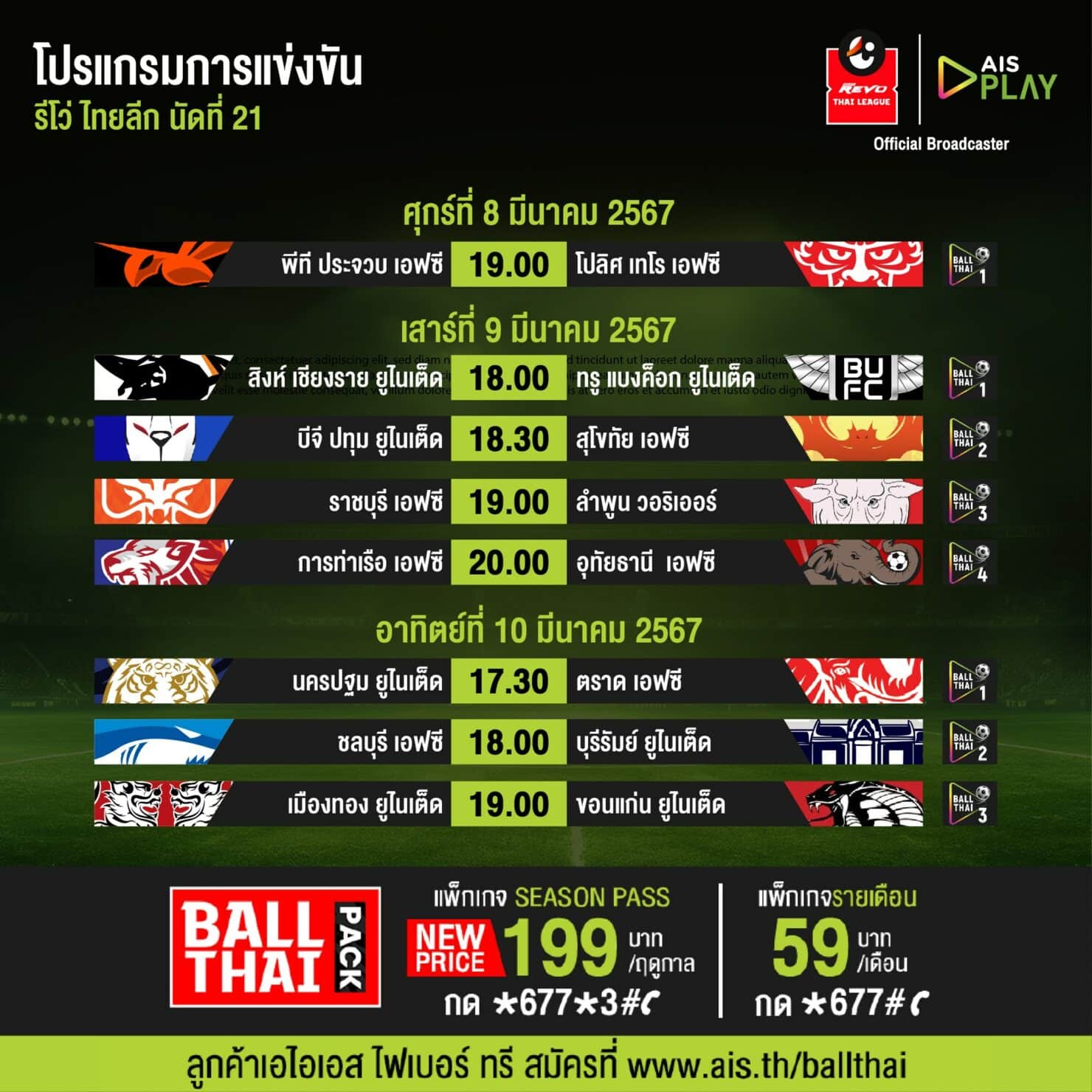 - 17:30 นครปฐม ยูไนเต็ด พบ ตราด เอฟซี