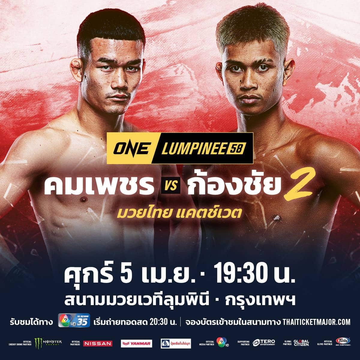 เปิดโปรแกรมเดือดเรียกเสียงฮือฮาจากแฟนกีฬาการต่อสู้แบบไม่มีพักสำหรับศึกนัดยิ่งใหญ่ ONE ลุมพินี 58 หลังเผยโฉมไฟต์รีแมตช์ของ 2 นักสู้ไฟแรงประจำรายการ ระหว่าง “คมเพชร แฟร์เท็กซ์” มวยขวาเหลี่ยมดี วัย 23 ปี จากเมืองย่าโมโคราช ปะทะ “ก้องชัย ไฉนดอนเมือง” มวยซ้ายบู๊มัน วัย 21 ปี จากบุรีรัมย์ โดยเตรียมวัดพลังแกร่งกันภายใต้กติกามวยไทย พิกัดเฉพาะ (แคตช์เวต) 126 ป.
