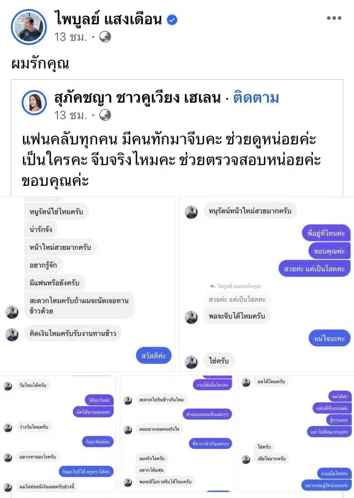 พอเป็นโสดก็ต้องมีเหงาบ้าง งานนี้ ครูไพบูลย์ แสงเดือน เลยต้องหาคนดามใจด้วยการเดินหน้าจีบ หนูรัตน์-สุภัคชญา ชาวคูเวียง หรือ น้องเฮเลน เน็ตไอดอลสาวที่สถานะหัวใจยังว่างเช่นกัน โดยฝ่ายหญิงเปิดแชตที่ครูหนุ่มทักมาจีบ ผ่านเฟซบุ๊ก สุภัคชญา ชาวคูเวียง เฮเลน อ่านแล้วอึ้งทั้งโซเชียล