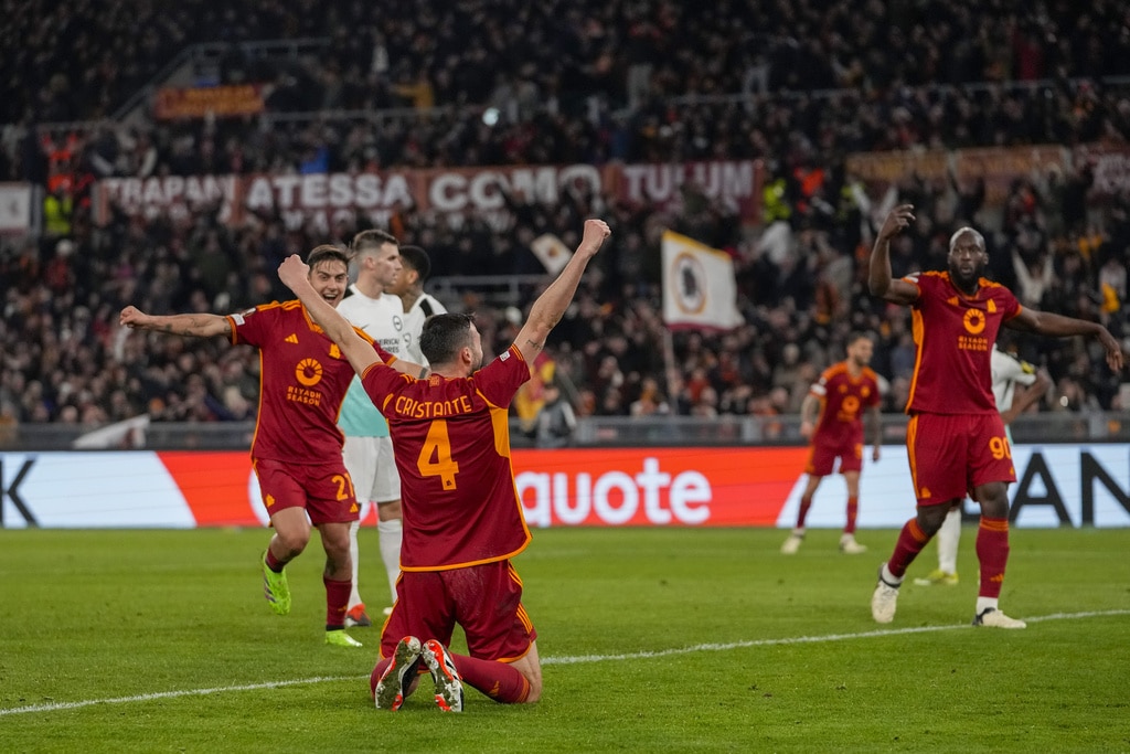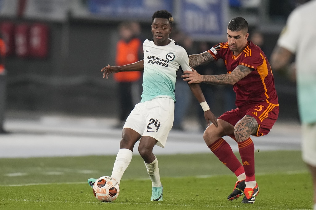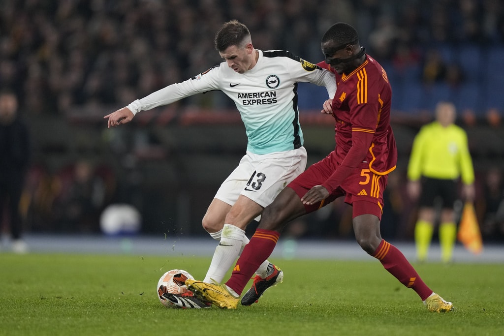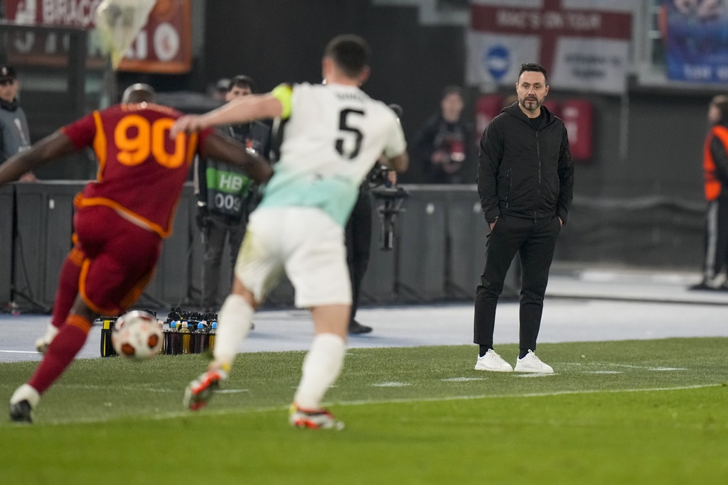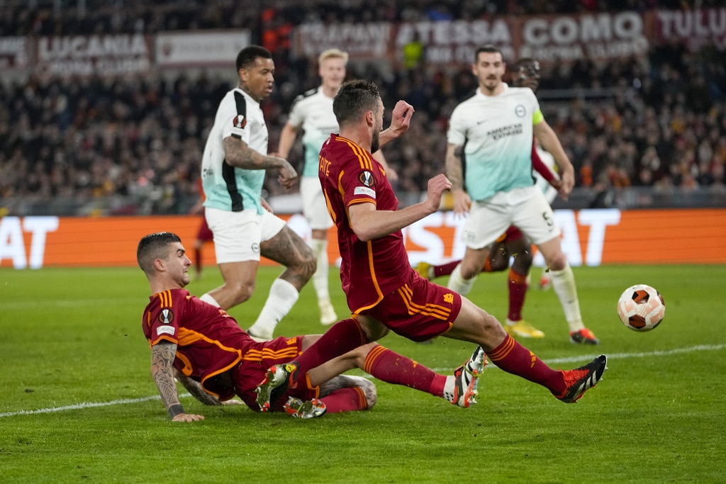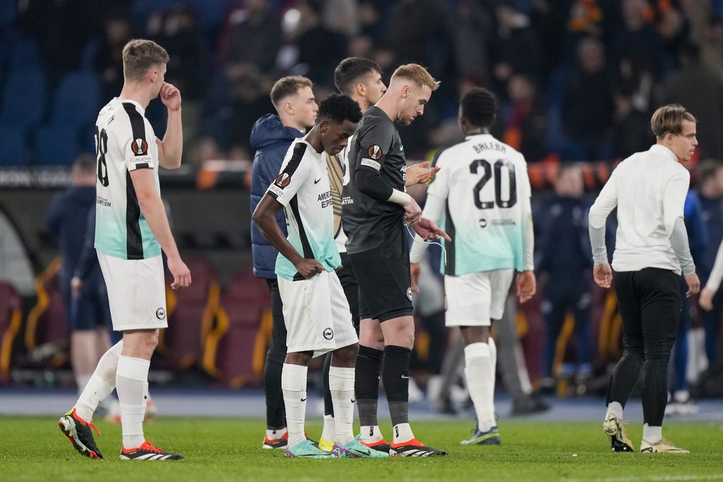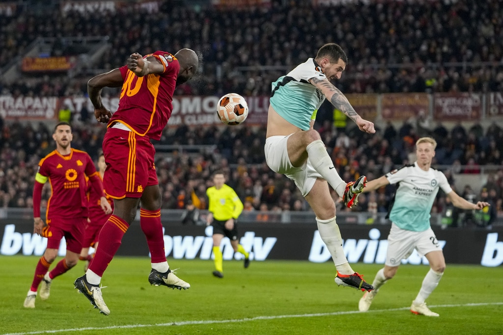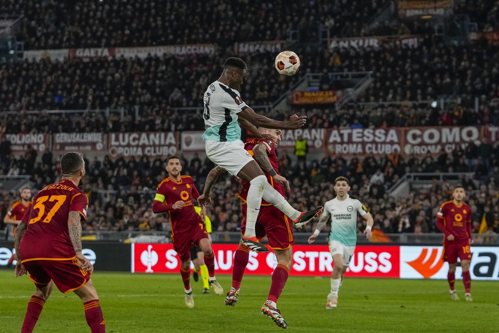 Brighton’s Danny Welbeck, top, jumps to head on goal during the Europa League round of sixteen first leg soccer match between Roma and Brighton and Hove Albion, at Rome’s Olympic Stadium, Thursday, March 7, 2024. (AP Photo/Alessandra Tarantino)Brighton’s players react disappointed after the Europa League round of sixteen first leg soccer match between Roma and Brighton and Hove Albion, at Rome’s Olympic Stadium, Thursday, March 7, 2024. Roma won 4-0. (AP Photo/Andrew Medichini)Roma’s Tommaso Baldanzi, right, challenges Brighton’s Pervis Estupinan during the Europa League round of sixteen first leg soccer match between Roma and Brighton and Hove Albion, at Rome’s Olympic Stadium, Thursday, March 7, 2024. (AP Photo/Alessandra Tarantino)Brighton’s Simon Adingra, left, is challenged by Roma’s Gianluca Mancini during the Europa League round of sixteen first leg soccer match between Roma and Brighton and Hove Albion, at Rome’s Olympic Stadium, Thursday, March 7, 2024. (AP Photo/Alessandra Tarantino)Brighton’s head coach Roberto De Zerbi looks on from the sideline during the Europa League round of sixteen first leg soccer match between Roma and Brighton and Hove Albion, at Rome’s Olympic Stadium, Thursday, March 7, 2024. (AP Photo/Alessandra Tarantino)Roma’s Bryan Cristante, front, celebrates scoring his side’s 4th goal during the Europa League round of sixteen first leg soccer match between Roma and Brighton and Hove Albion, at Rome’s Olympic Stadium, Thursday, March 7, 2024. (AP Photo/Alessandra Tarantino)Roma’s Gianluca Mancini, bottom, scores his side’s 3rd goal during the Europa League round of sixteen first leg soccer match between Roma and Brighton and Hove Albion, at Rome’s Olympic Stadium, Thursday, March 7, 2024. (AP Photo/Alessandra Tarantino)Brighton’s Pascal Gross, left, and Roma’s Evan Ndicka fight for the ball during the Europa League round of sixteen first leg soccer match between Roma and Brighton and Hove Albion, at Rome’s Olympic Stadium, Thursday, March 7, 2024. (AP Photo/Andrew Medichini)Brighton’s Lewis Dunk, right, tries to block a header of Roma’s Romelu Lukaku during the Europa League round of sixteen first leg soccer match between Roma and Brighton and Hove Albion, at Rome’s Olympic Stadium, Thursday, March 7, 2024. (AP Photo/Alessandra Tarantino)