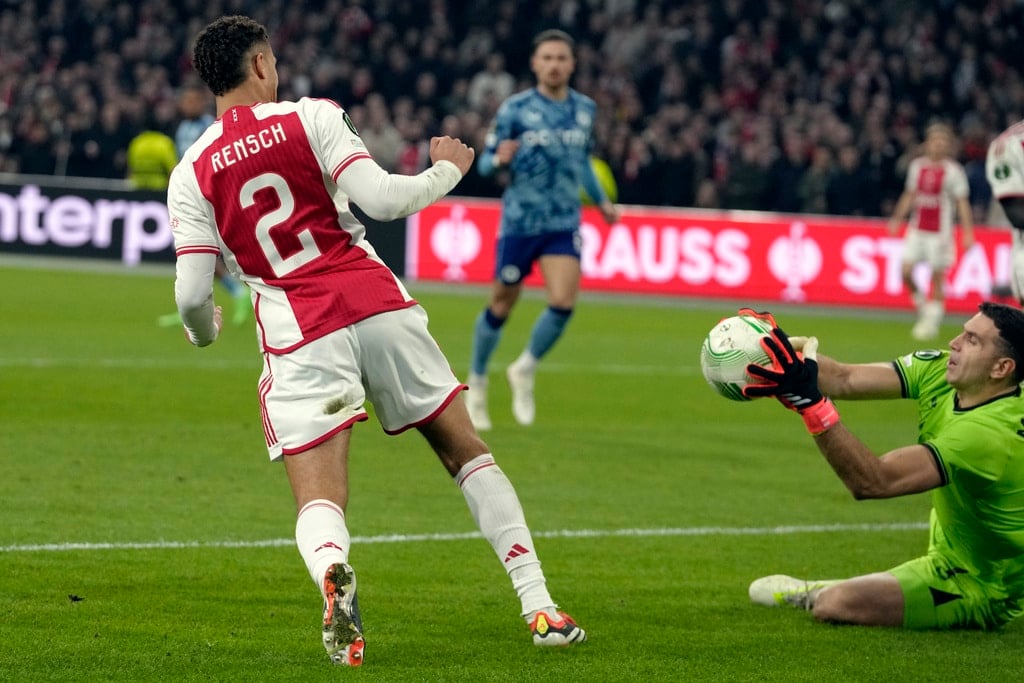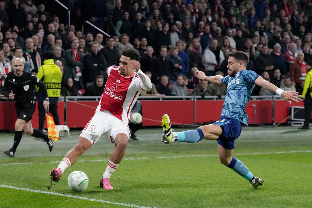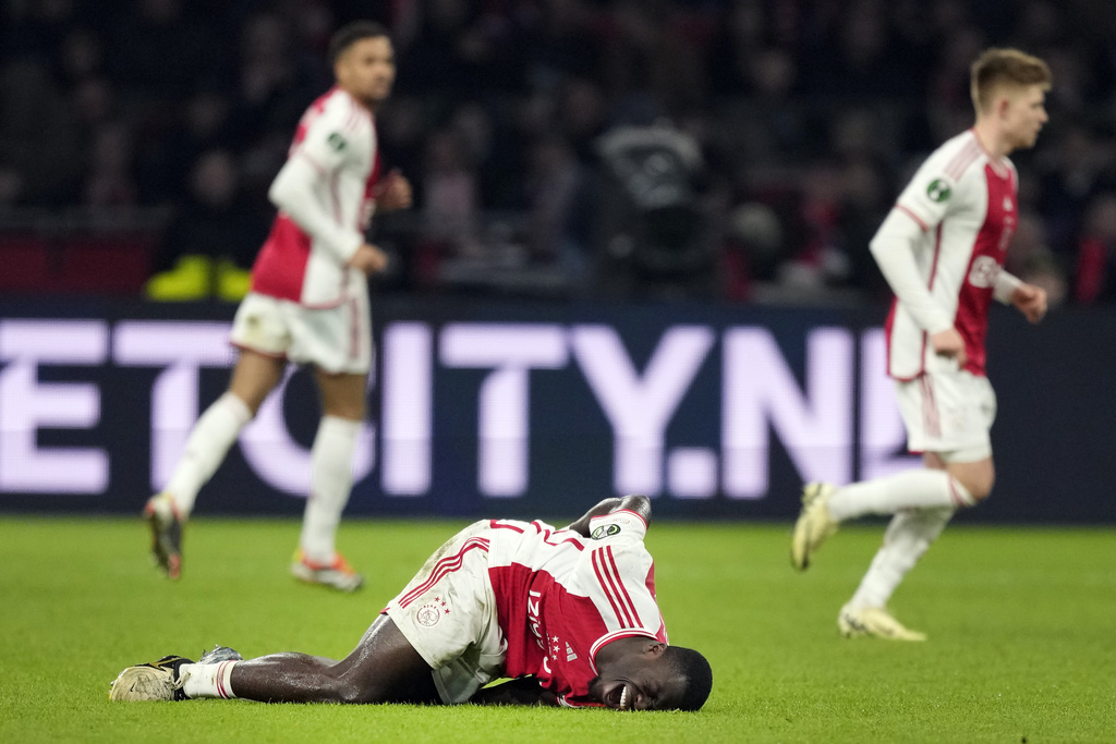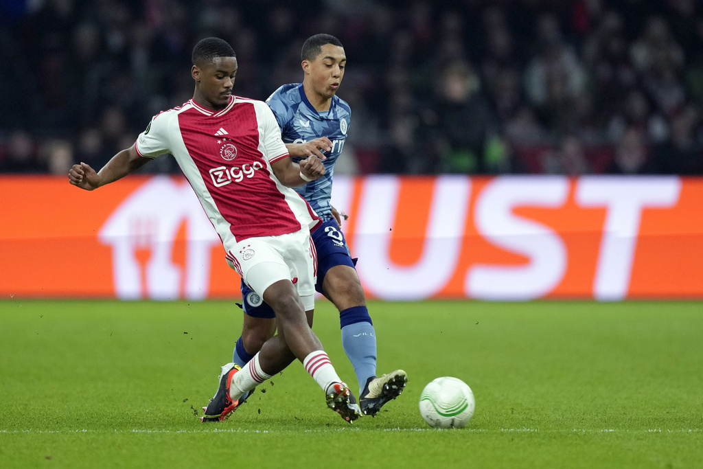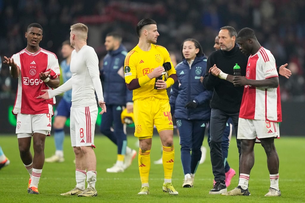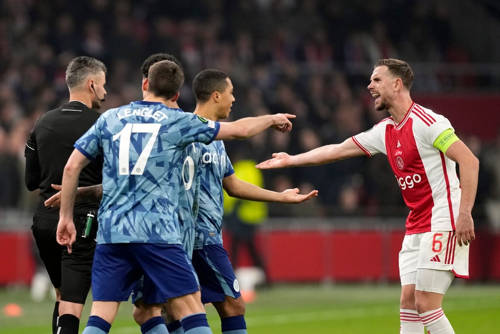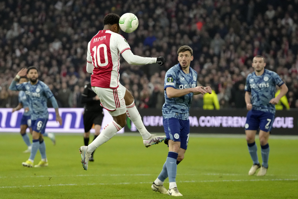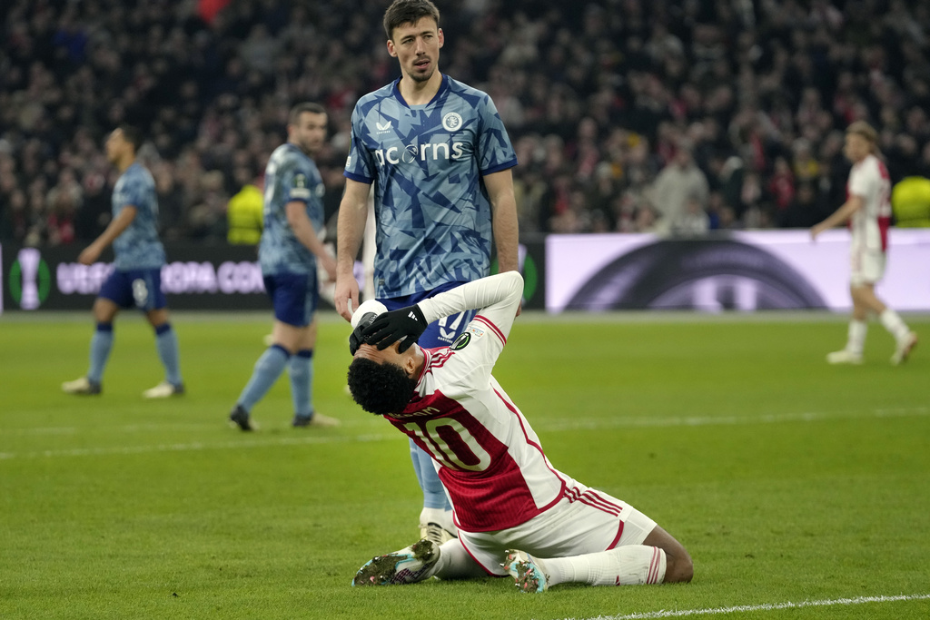 Aston Villa’s Youri Tielemans, front, battles for the ball with Ajax’s Sivert Mannsverk during the Europa Conference League round of 16 first leg soccer match between Ajax and Aston Villa at Johan Cruyff ArenA stadium in Amsterdam, Netherlands, Thursday, March 7, 2024. (AP Photo/Peter Dejong)Ajax’s Chuba Akpom, bottom, gestures next to Aston Villa’s Clement Lenglet during the Europa Conference League round of 16 first leg soccer match between Ajax and Aston Villa in Amsterdam, Netherlands, Thursday, March 7, 2024. (AP Photo/Peter Dejong)Ajax’s Jordan Henderson, right, talks to Aston Vila’s players and Albanian referee Enea Jorgji, left, during the Europa Conference League round of 16 first leg soccer match between Ajax and Aston Villa at Johan Cruyff ArenA stadium in Amsterdam, Netherlands, Thursday, March 7, 2024. The match ended in a 0-0 draw. (AP Photo/Peter Dejong)Ajax’s Chuba Akpom, top, heads the ball during the Europa Conference League round of 16 first leg soccer match between Ajax and Aston Villa at Johan Cruyff ArenA stadium in Amsterdam, Netherlands, Thursday, March 7, 2024. The match ended in a 0-0 draw. (AP Photo/Peter Dejong)Ajax’s Tristan Gooijer, left, shoots the ball next to Aston Villa’s Alex Moreno during the Europa Conference League round of 16 first leg soccer match between Ajax and Aston Villa at Johan Cruyff ArenA stadium in Amsterdam, Netherlands, Thursday, March 7, 2024. The match ended in a 0-0 draw. (AP Photo/Peter Dejong)Ajax’s head coach John van’t Schip, second right, talks to Ajax’s Brian Brobbey, right, and goalkeeper Diant Ramaj at the end of the Europa Conference League round of 16 first leg soccer match between Ajax and Aston Villa at Johan Cruyff ArenA stadium in Amsterdam, Netherlands, Thursday, March 7, 2024. The match ended in a 0-0 draw. (AP Photo/Peter Dejong)Aston Villa’s goalkeeper Emiliano Martinez, right, makes a save of a shot by Ajax’s Devyne Rensch during the Europa Conference League round of 16 first leg soccer match between Ajax and Aston Villa at Johan Cruyff ArenA stadium in Amsterdam, Netherlands, Thursday, March 7, 2024. (AP Photo/Peter Dejong)Ajax’s Brian Brobbey grimaces in pain after being tackled down during the Europa Conference League round of 16 first leg soccer match between Ajax and Aston Villa at Johan Cruyff ArenA stadium in Amsterdam, Netherlands, Thursday, March 7, 2024. (AP Photo/Peter Dejong)Ajax’s Jorrel Hato, left, tussles for the ball with Aston Villa’s Youri Tielemans during the Europa Conference League round of 16 first leg soccer match between Ajax and Aston Villa at Johan Cruyff ArenA stadium in Amsterdam, Netherlands, Thursday, March 7, 2024. (AP Photo/Peter Dejong)