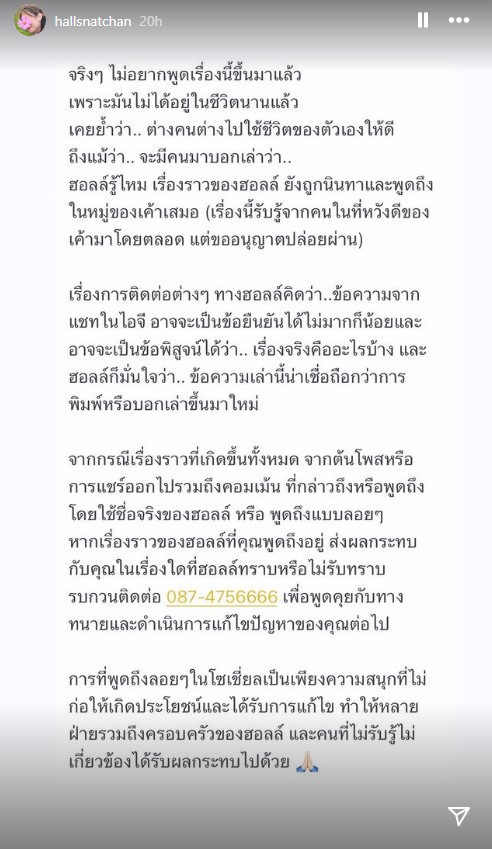 “จริง ๆ ไม่อยากพูดเรื่องนี้ขึ้นมาแล้ว เพราะมันไม่ได้อยู่ในชีวิตนานแล้ว เคยย้ำว่า..ต่างคนต่างไปใช้ชีวิตของตัวเองให้ดี ถึงแม้ว่า.. จะมีคนมาบอกเล่าว่า.. ฮอลล์ รู้ไหม เรื่องราวของฮอลล์ ยังถูกนินทา และพูดถึงในหมู่ของเค้าเสมอ (เรื่องนี้รับรู้จากคนในที่หวังดีของเค้ามาโดยตลอด แต่ขออนุญาตปล่อยผ่าน)”
